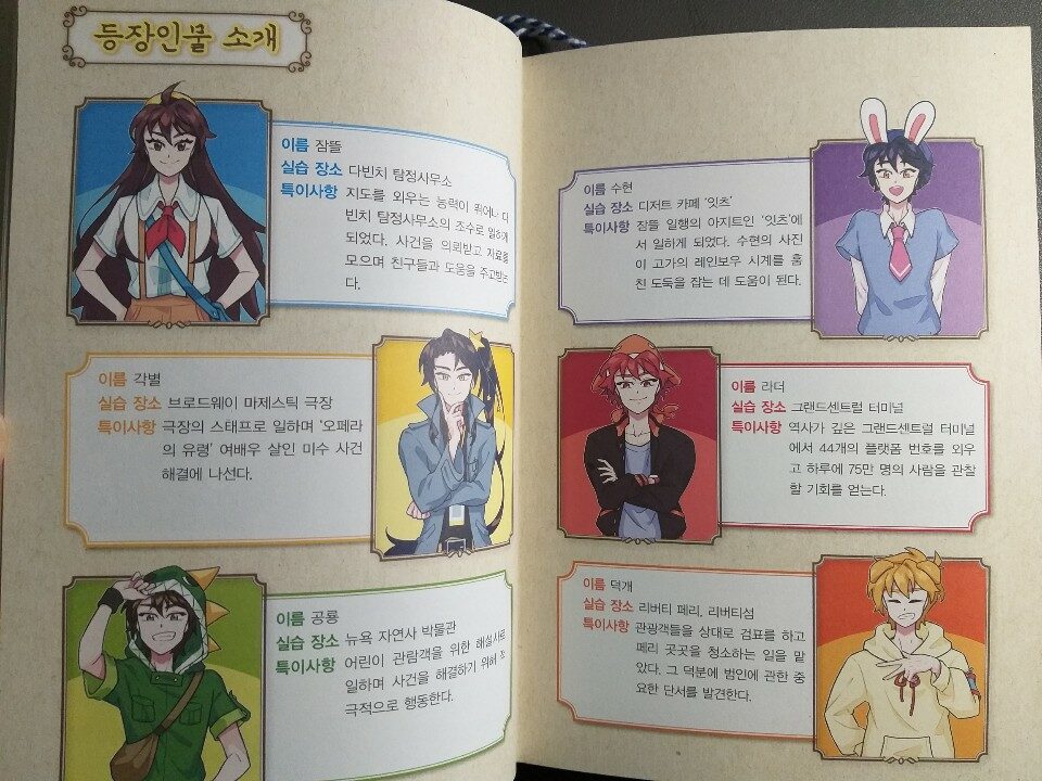 등장인물은 잠뜰 TV의 메인 캐릭터, 잠뜰, 각별, 공룡, 수현, 라더, 그리고 덕개입니다. 오리지널 스토리북에서 만난 것과 같은 캐릭터 그림이지만 직업, 특이사항 등 설정은 조금씩 다르네요. 순정만화를 연상시키는 예쁜 그림체라 아이가 좋아했어요.