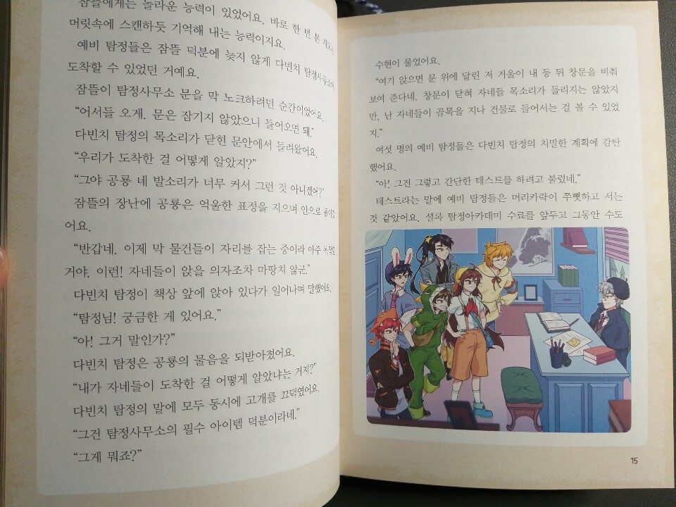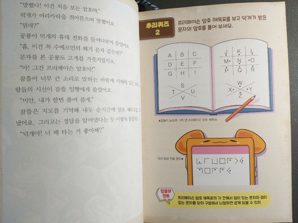 여섯 명의 예비 탐정 잠뜰, 각별, 공룡, 수현, 라더, 덕개와 함께 18가지 흥미진진한 추리 퀴즈를 풀어봐요. 프리메이슨 암호, 2진법 알파벳 암호, 방탈출, 단서로 유추하기 등 재미있는 추리 퀴즈가 많네요. 어른인 저도 함께 풀어봤는데 제법 머리를 써야 하더라고요.