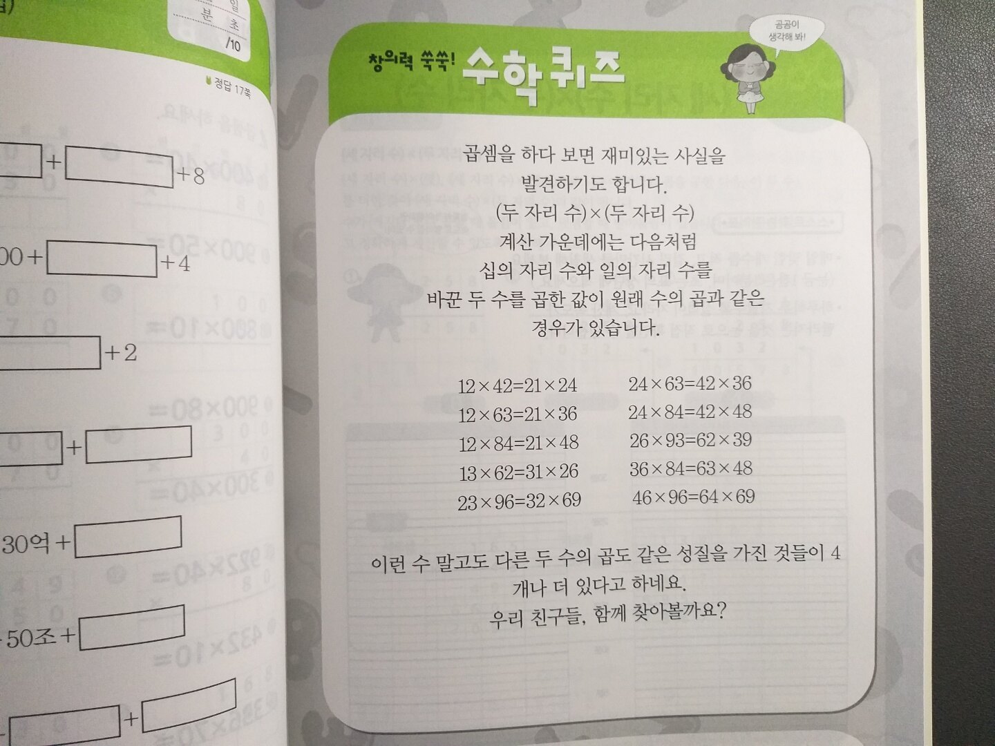 세 번 정도는 혼자서 생각해보게 하고, 도움을 요청할 때는 힌트도 하나씩 주면서 부모님과 함께 풀어봐도 좋아요. 사실 저도 전혀 모르는 문제도 있었는데 답을 슬쩍 보고 아는 척 하기도 했다는... ㅎㅎ 저도 두뇌회전 좀 시켜야 겠어요.