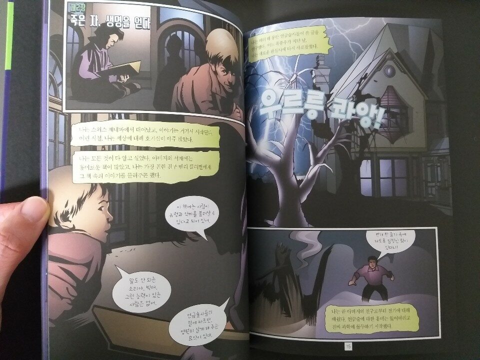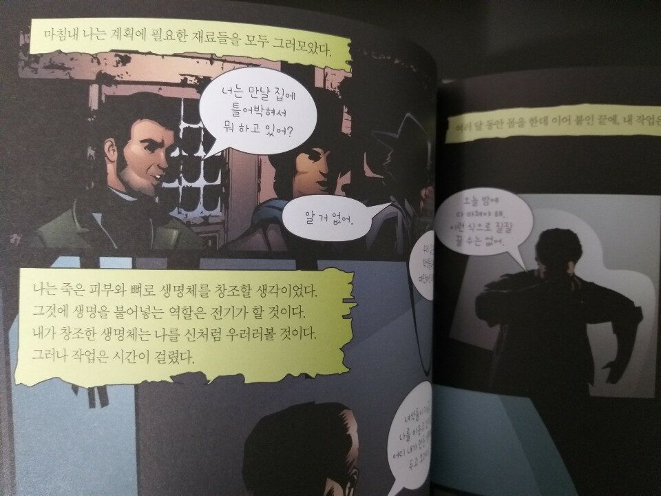 프랑켄슈타인은 워낙 많은 공포 영화나 드라마의 소재가 되어서 알아두면 좋은 작품이죠. 괴물이 나오는 작품이라 아이가 무서워하지 않을까 생각했는데 의외로 공포보다는 재미있었다고 하네요. 죽은 것에 생명을 불어넣고 창조하는게 진짜 가능할지 궁금해하기도 하고요.