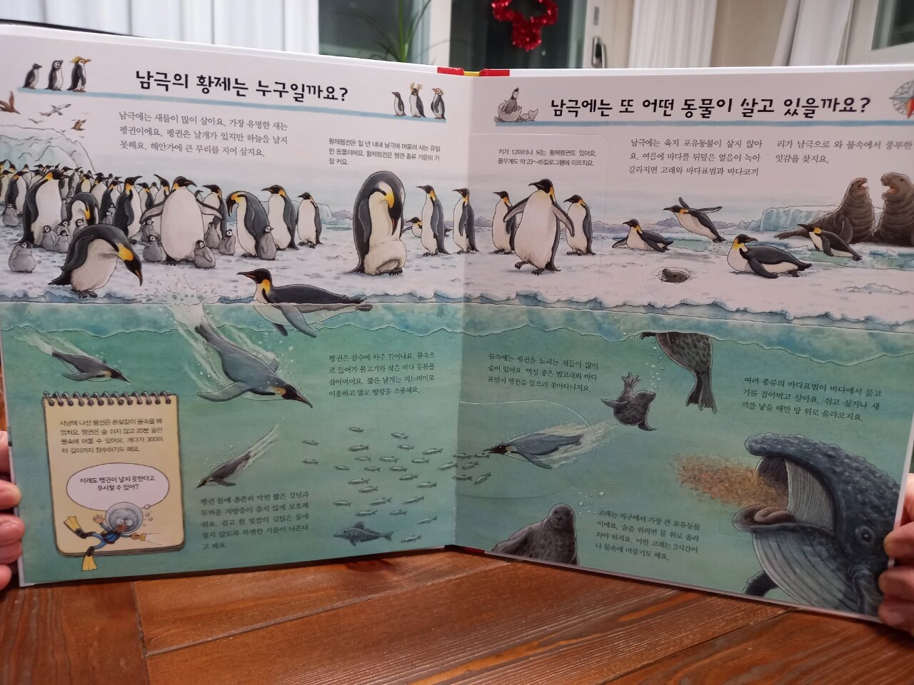 특히, 북극과 남극 대탐험은 플랩북으로 구성된 놀이북 형식으로 아이들이 흥미를 가지고 읽을 수 있어요. 흥미로운 플랩을 넘겨보면 그림과 관련된 간단한 설명이 나와 있어서 아이가 무척 재미있어 하네요. 얼음 조각, 온도계, 북극곰, 펭귄, 책 그림 등을 넘겨보면서 과학지식을 스스로 발견하는 즐거움이 있어요!