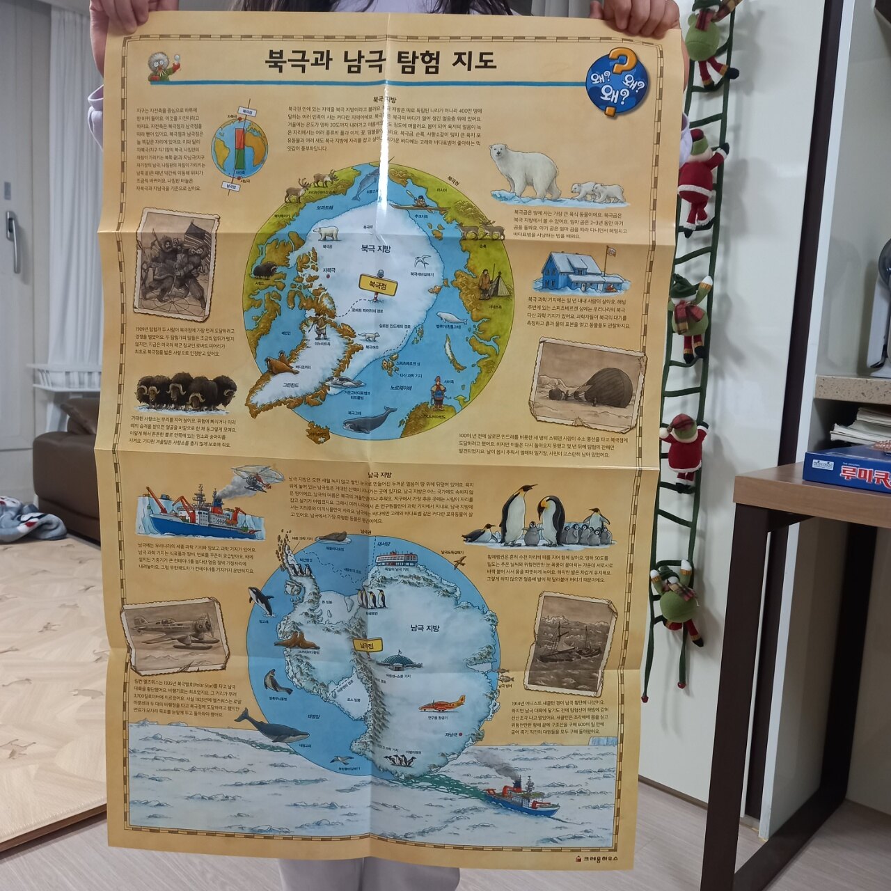 북극과 남극 대탐험에는 153cm 우리 아이 키보다 조금 작은 북극과 남극 탐험 지도가 별책 부록으로 제공되어 아이들의 과학적 호기심과 책 읽는 즐거움을 더하고 있어요. 책 속의 내용들이 탐험지도로 한눈에 정리되어 있는 느낌이더라고요.