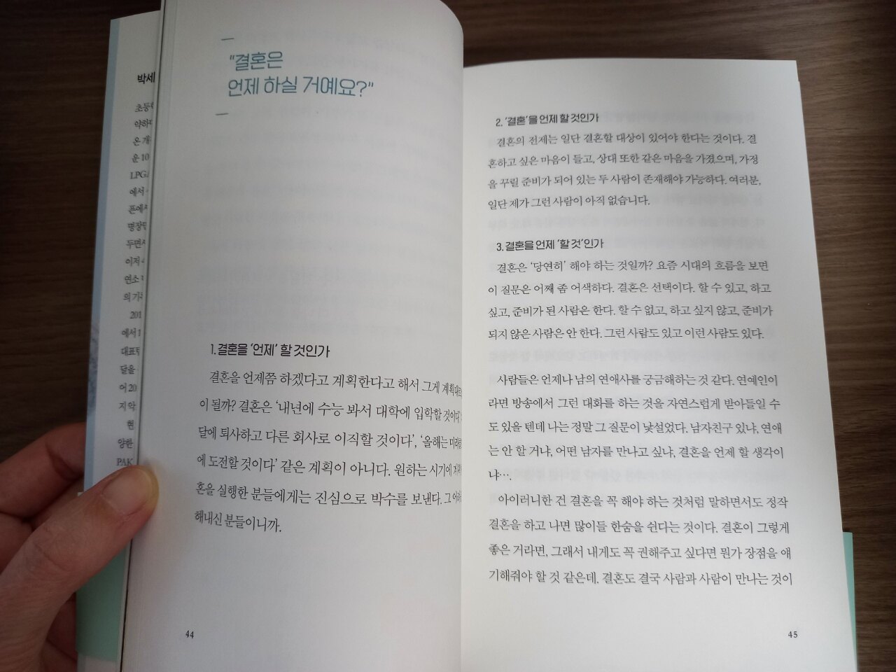 결혼을 꼭 해야 하는 것처럼 말하는 사람들이 정작 결혼을 하고나면 그렇게들 한숨을 쉰다는 대목에서는 현실 웃음이 터져나오더라고요. 이제 박세리님께 결혼 질문은 좀 삼가시고, 책을 통해 그녀의 생각을 확인해보세요^^
