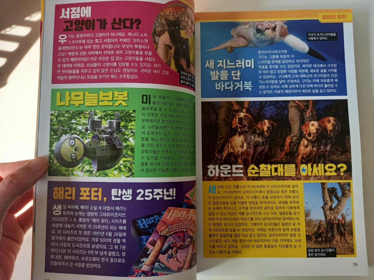 그런데 해리포터 탄생 25주년 같은 올해의 토픽, 세계의 교통수단, 전사들의 전투복, 5가지 멋진 발명품, 갈라파고스 제도에 대한 10가지 사실 등 다양한 역사/문화/지리/과학/탐험 주제가 가득하더라고요.