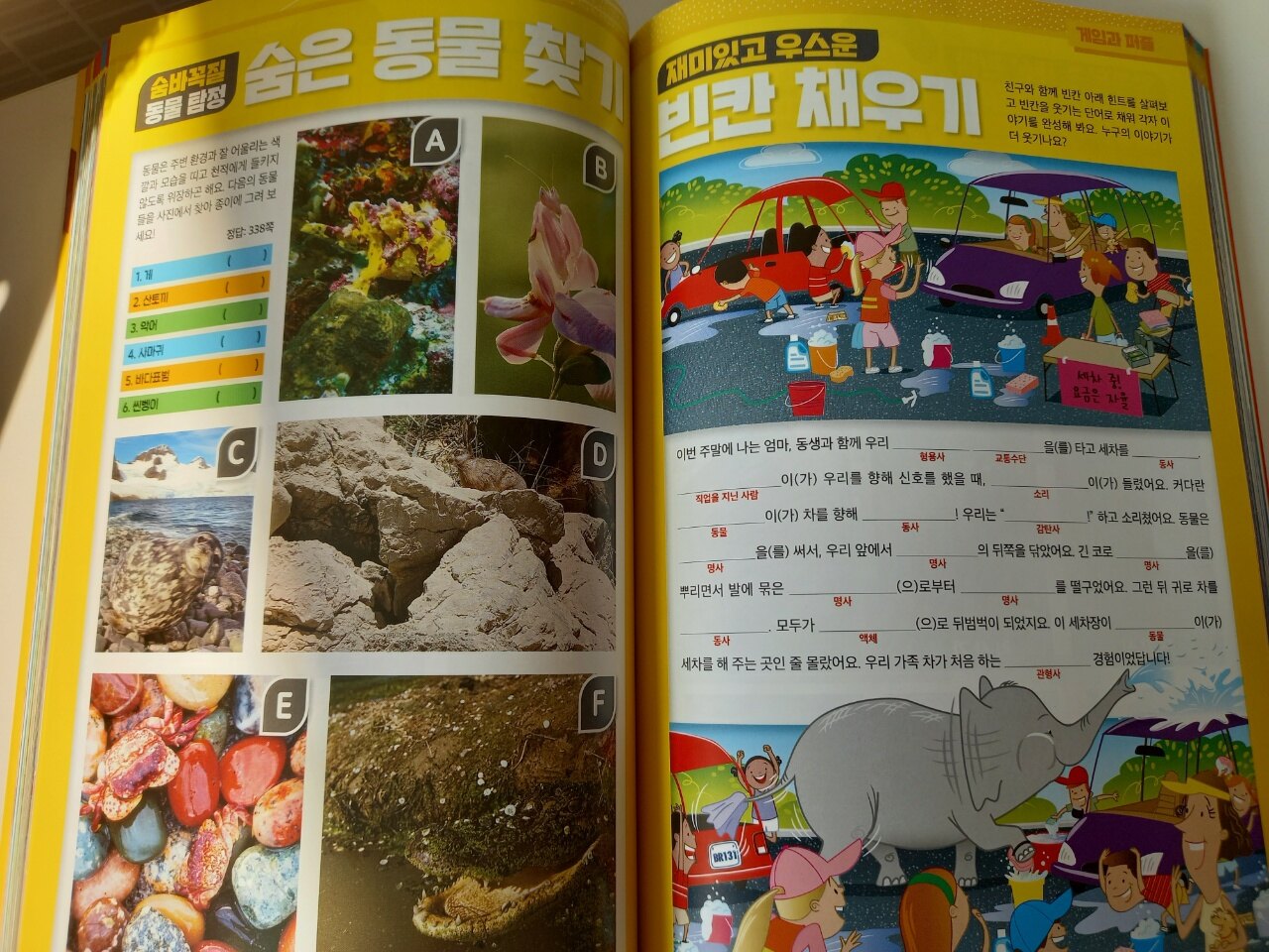 숨은 그림 찾기, 빈칸 채우기 등 게임과 퍼즐 활동도 있어서 아이가 재미있게 해보네요. 예상치 못하게 만화도 있고, 잠깐 퀴즈도 중간중간 툭 튀어나오는 구성이라 놀라운 즐거움이 가득한 책이에요.
