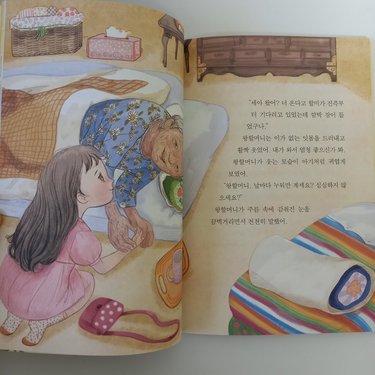 하지만 우리 딸 아이에게는 할머니와 외할머니, 그리고 증조할머니까지 살아계셔서 참 다행이고 추억을 많이 남겼으면 하는 마음이에요. 책을 읽으면서 요양병원에서 거동이 불편하셔서 누워만 계신 증조할머니를 떠올렸을까 궁금해하기도 했어요.