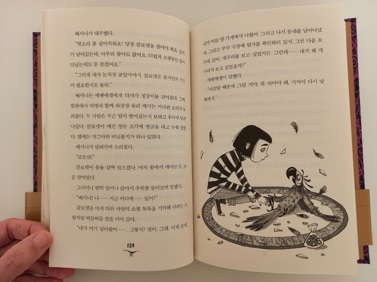 <베서니와 괴물의 묘약>은 밤에 자기 전 틀어놓고 오디오북으로 들었는데, 괴물 목소리도 실감나고 스토리 전개도 정말 흥미진진했어요. 그런데 <베서니와 괴물의 복수>를 실물 책으로 만나보니까 역시 오디오북만으로는 충분하지 않더라고요. 양장본의 고급스러운 책을 소장하는 기쁨과 함께 섬세하고 재미있는 일러스트들도 만날 수 있어 1권도 함께 소장해야 겠다는 생각이 들었어요.