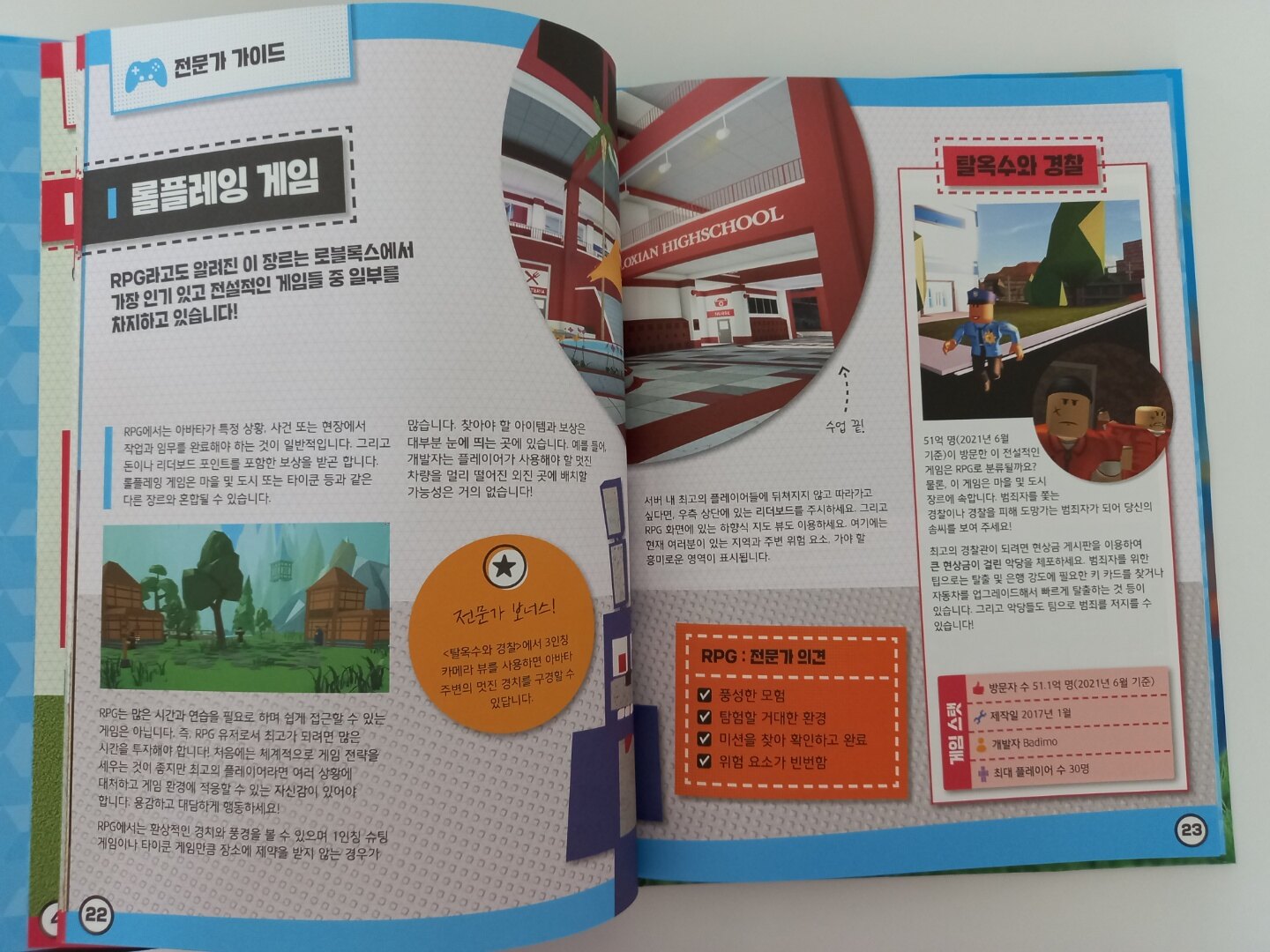 이 책 <로블록스 초보자 가이드>는 로블록스 화면 및 컨트롤 기본 소개부터 아바타 스타일 만들기, 게임 안전 기능 등 게임을 시작하기 전 꼭 필요한 정보부터 담고 있어요. 로블록스 게임을 어느 정도 즐겨온 친구들은 게임 종류별 전문가 가이드를 집중적으로 보면 좋을 듯 해요. 롤플레잉 게임, 시뮬레이터 게임, 장애물 게임 등 게임 종류별로 구체적인 팁과 전략, 트릭 등이 알차게 실려 있더라고요.