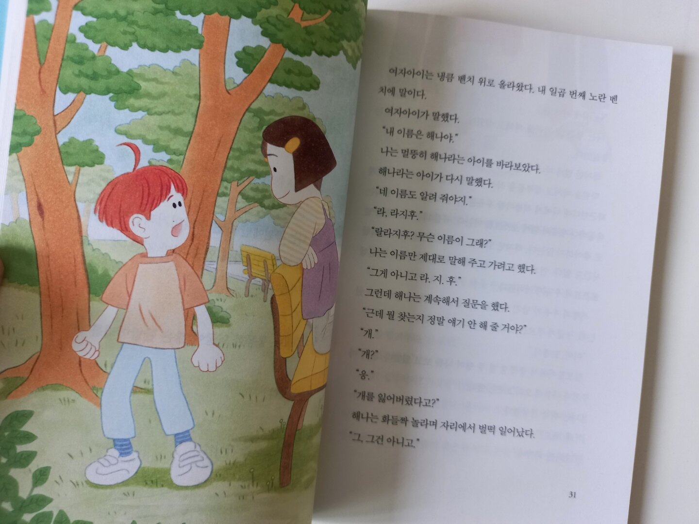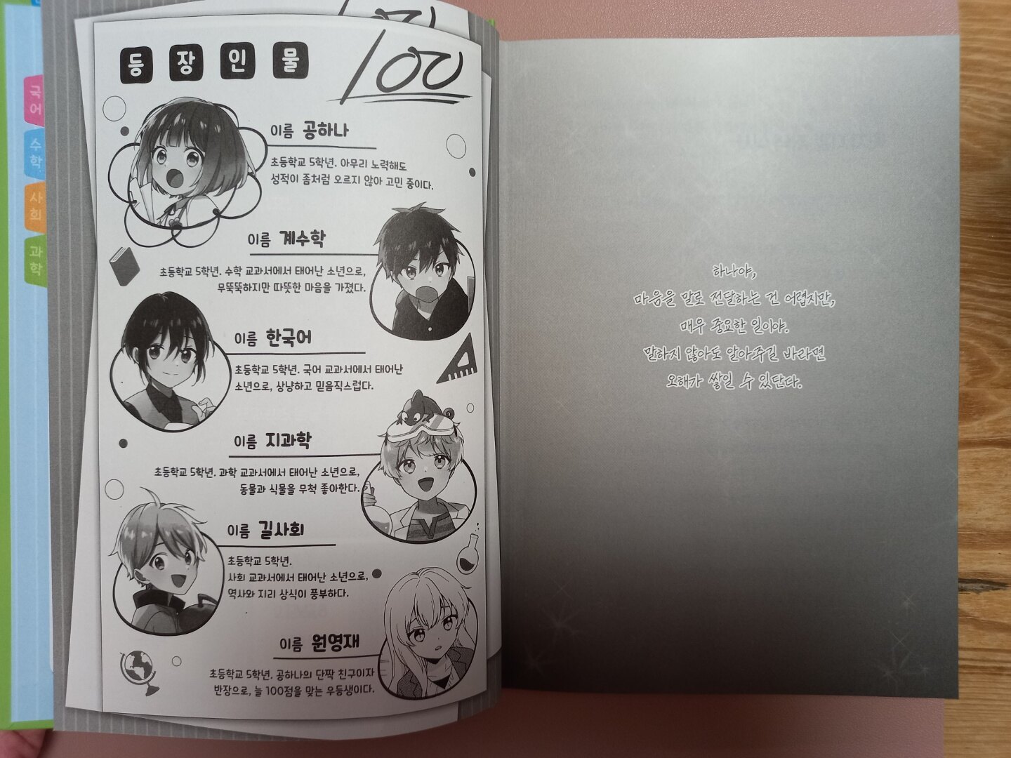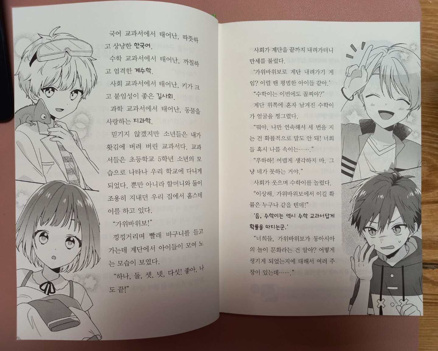<시간표 소년>은 좀처럼 성적이 오르지 않아 고민인 초등학교 5학년 소녀 공하나가 주인공이에요. 하나는 교과서에서 태어난 소년들인 계수학, 한국어, 지과학, 길사회와 함께 열심히 공부한 덕분에 마침내 시험 성적이 오르게 돼요. 하나의 시험 성적이 올라야 소년들의 수명이 늘어난다는 설정이 아주 독특하고 재미있네요.