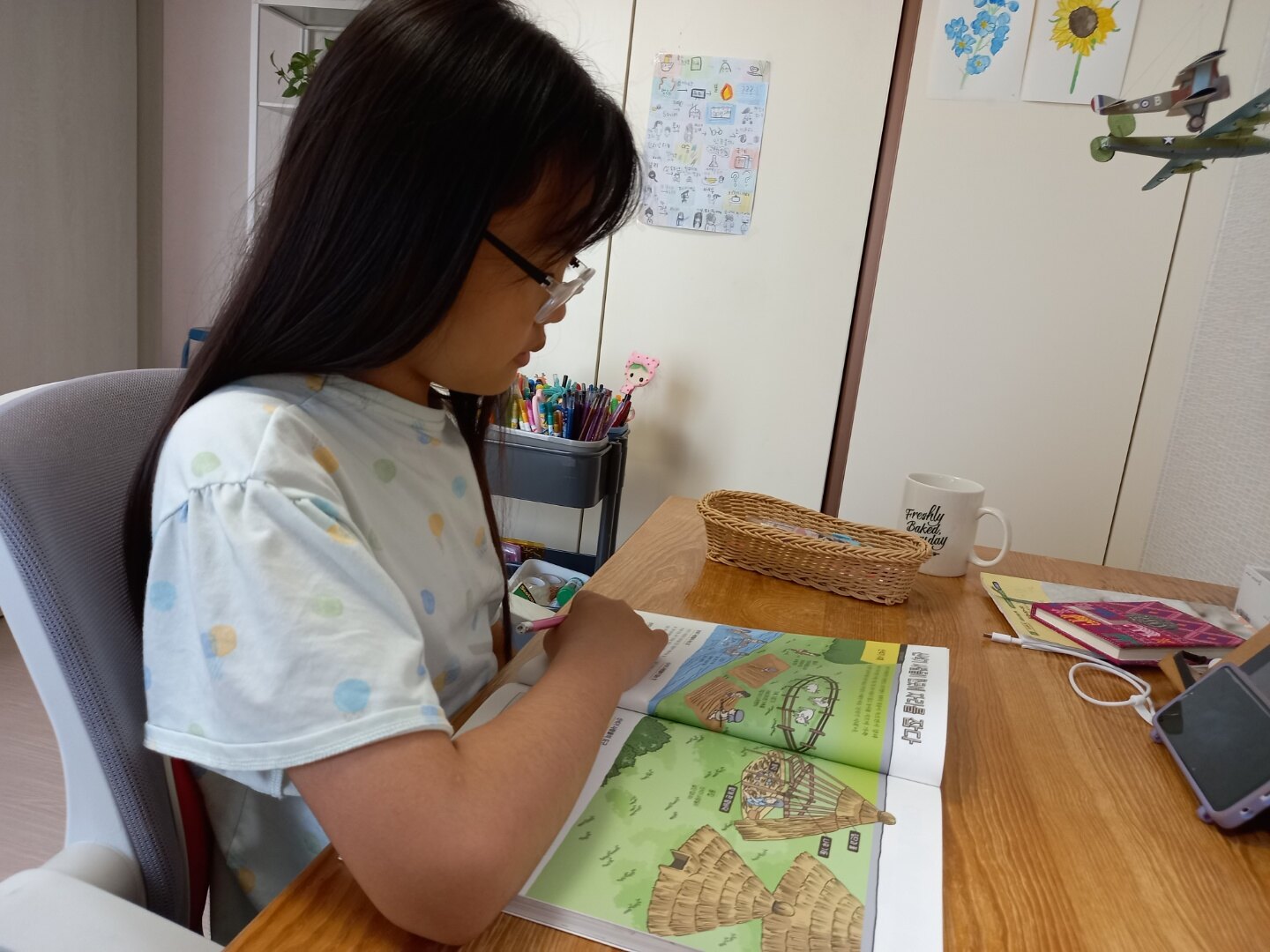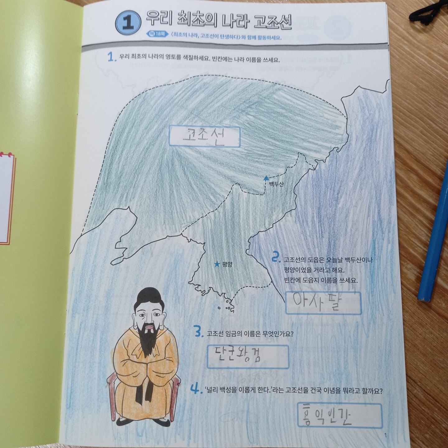 오늘은 우리 최초의 나라 고조선에 대해서 읽어보고 백지도 워크북에 정리도 해 보았어요. 단군왕검, 아사달, 홍익인간이라는 핵심 키워드를 머릿속에 새겨보고, 고조선의 영토를 색칠하면서 지도상에서 그 세력을 확인해볼 수 있었어요.