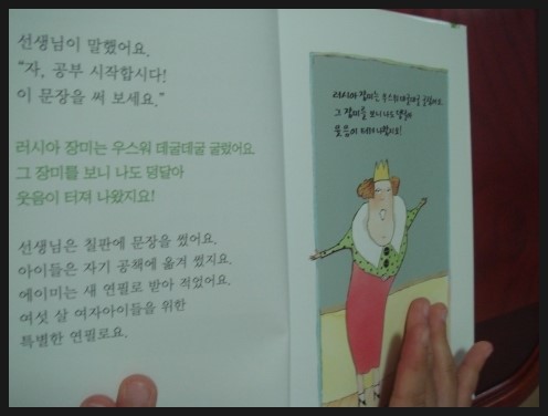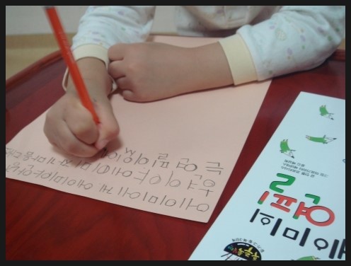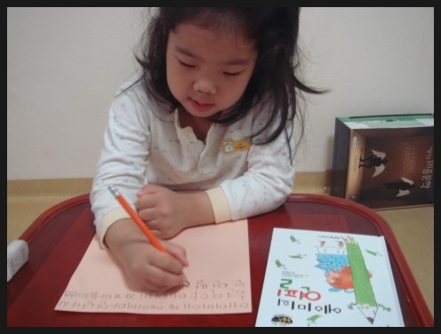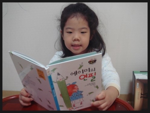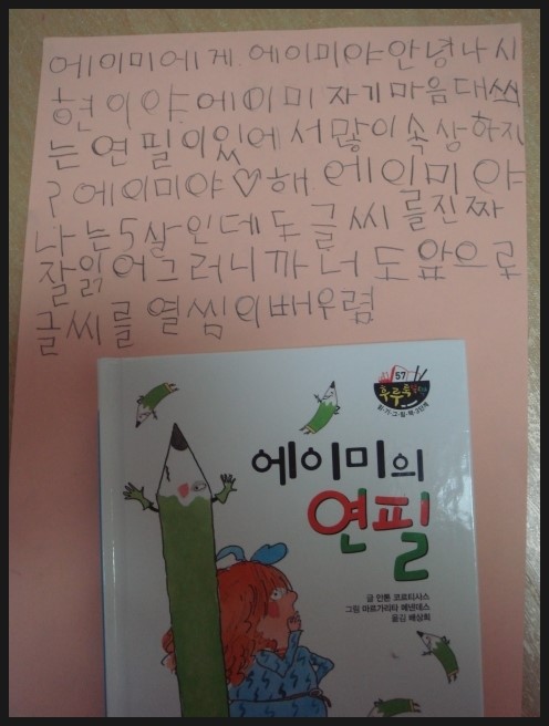 후루룩 뚝딱 그림책 에이미의 연필. 글 안톤 코르티사스 / 그림 마르가리타 메넨데스 / 옮김 배상희 후루룩 뚝딱 그림책 3단계 57번 - 에이미의 연필을 읽어보았어요. 3단계면 뭐가 높은거냐고 물어보며 기대가 컸습니다. 아이가 1, 2단계를 지나면서 점점 단계가 높아지는것에 대한 성취감도 느끼고 자신있는 모습을 보였습니다. 주인공 에이미는 여섯살입니다. 아이가 '어? 나보다 언니네~' 라며 친근감을 보였습니다. 유치원에서 읽고 쓰기를 이제 막 배웠지요. 호기심도 많고 그림그리고 쓰기도 좋아하는 모습이 딸아이와 똑같습니다. 어느날 아빠가 사준신 예쁜 연필을 갖게되는데, '여섯 살 여자아이들을 위한 특별한 연필'이었지요. 아이가 같은 또래의 이야기에 더욱 흥미있어하고 친근한 소재인 연필에도 관심을 많이 보였습니다. 그 연필은 신기하게도 연필 마음대로 써지는 정말 정말 특별한 연필이었지요. 책속에 등장하는 에이미의 친구들도 그 신기한 연필을 써 보고싶어 했습니다. 에이미는 소중한 연필과 교감을 하고 따뜻한 마음도 나누게 됩니다. 아이가 '엄마, 나도 이런 연필이 있었으면 좋겠다' 며 에이미를 부러워하기도 했습니다. 한편으로는 에이미가 쓰고 싶은데로 써지질 않으니까 속상하겠다고도 이야기 했습니다. 책을 읽으면서 연필과 같은 작은 물건들도 더 아끼고 소중히 생각할 줄 아는 마음도 가졌으면 좋겠다고 엄마의 바램도 살짝 이야기해 보았습니다. 책을 한번에 다 읽고 아이가 좀 지쳐했는데 두께를 보니 상당히 두꺼워 페이지를 확인해보니 64페이지나 되었습니다. 5살 아이에겐 많은 글밥이었는데 너무 재미있어서 참고 끝까지 읽었다고 하네요. 에이미에게 편지를 써보고 싶다고 해서 종이를 직접 고르고 써보았습니다. 책을 읽고 바로 편지를 쓰다보니 너무 힘들어해서 끝인사까지는 못썼습니다. 틀린 글자가 있긴 했지만 바로 지적은 하지 않고 잘 썼다고 칭찬해 주었습니다.