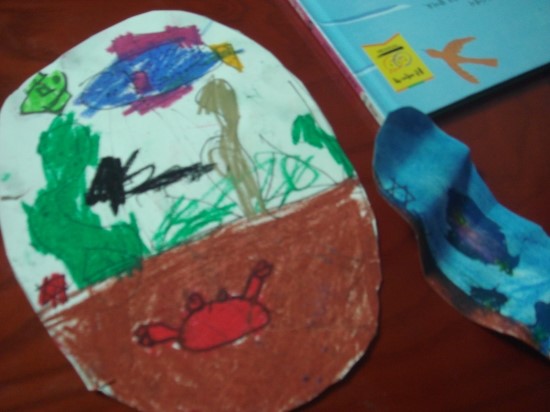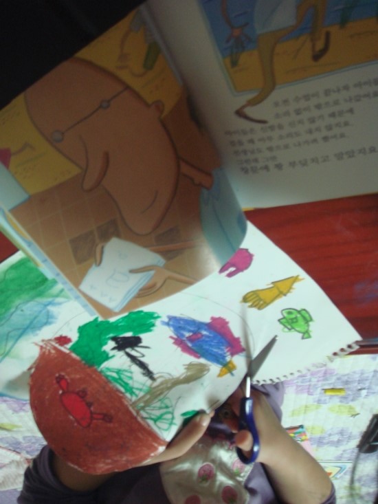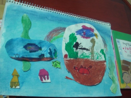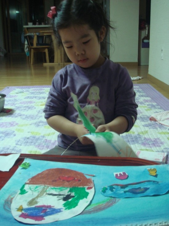 지난번에 다 완성하지 못한 바다그림을 그려보기로 했습니다. 스케치북에 그린 바다 그림들을 가위로 오려내고 다른 바탕에 붙여서 입체감을 내 보기로 했습니다. 가위질이 서툴지만 아이 스스로 해보라고 엄마의 도움은 전혀 주지 않았습니다. 삐뚤 삐뚤 매끄럽지 않아도 잘한다고 칭찬해주니 더욱 자신감을 보였습니다. 엄마의 생각은 바닷속에 그린 물고기며 해초들을 하나 하나 잘라서 붙여보길 바랬는데 아이는 바다를 통째로 오려서 붙이겠다고 합니다. 나름대로 꽃게와 불가사리도 그렸네요. 다른 종이에 파스텔로 바탕이 되는 바다를 칠했습니다. 파란색도 흐린색, 진한색, 여러가지로 표현해보았습니다. 면적이 넓어서 손으로 문지르지않고 휴지로 전체적으로 문질러보았는데 색감이 뿌해지자 '와! 신기하다'며 좋아했습니다. 집에 풀이 없어서 뒷면에 스카치테이프를 말아서 붙였습니다. 아이가 꼼꼼히 붙이질못해 많이 들떠있지만 입체적으로 보이는것 같아 더 좋다고 격려했습니다. 큰 미역들을 잊고 안잘라서 다시 가위로 오려 붙였습니다. 붙일 자리가 없는것은 종이위에 끼워넣어 이중으로 붙여보기도 했습니다. 완성된 그림을 안젤라 책과 나란히 놓고 흐뭇해합니다. 내친김에 거실에 있는 어항에서도 찍어달라고 어항속이 바다랑 똑같다고 나란히 서보았습니다. 아이가 좋아하는 책을 반복해서 읽을수록 이해도 깊어지고 읽을 때마다 생각도 다양하고 넓어지는 것을 느꼈습니다. 또 좋아하는 책을 읽고나서 다양한 독후활동을 해보는 것이 책에 대한 사랑과 창의력과 상상력을 키워주고 아이의 기억속에 더 오래 남을것 같고 즐거운 추억도 되어 엄마도 아이도 행복한 시간이 되었습니다.