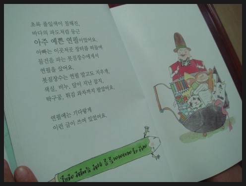 월드 김영사 - 후루룩 뚝딱 그림책 2단계 27번 녹색연 입니다. 글 모네하 델 아모 / 그림 니비오 로페스 비힐/ 옮김 배상희 어린이문화진흥회의 '좋은 어린이 책' 역시 믿음이 가네요^^ 안나의 아빠가 병원에서 퇴원을 하고 가족모두 시골집으로 향합니다. 흔희 동화책에서의 부모의 모습, 특히 아빠의 이미지는 항상 밝고 건강하고 모범적입니다. 아이들에게 큰 나무같이 넘치는 사랑을 주는 존재로 그려집니다. 그런데 '녹색연'에 등장하는 안나의 아빠는 키도 작아지고 몸도 줄어든 나약한 모습입니다. 최근에 병원신세를 많이 진 엄마를 생각해서인지 아이가 무척 걱정스런 얼굴로 진지하게 책을 읽었습니다. 아이들에게 엄마,아빠의 약한 모습은 큰 불안감을 줄텐데 책에서도 안나와 빌리오빠는 심각하게 이야기합니다. '줄어든 옷처럼 작아진 아빠가 다시 커질 수 있을까?' 하고 걱정을 합니다. 핵심이 되는 문장은 큰 글씨로 되어있어 시각적으로도 돋보였습니다. 아이들이 생각보다 심각하고 진지하게 어른을 걱정하는 모습이 새롭게 다가왔습니다. 하지만 아이들은 포기하거나 실망하지않고 활기찬 자연속에서 희망을 찾아냅니다. 아픈 아빠를 위하는 따뜻한 마음이 그대로 느껴진 감동적인 글은 어른에게도 새롭고 신선하게 다가왔고 아이들에게 상대를 배려하고 생각하는 마음을 심어줄수 있는 아름다운 동화였습니다. 아이가 글을 다 읽고 녹색연을 그려보고 싶다고 했습니다. 아빠에게 힘이 되어주고 희망을 준 녹색연이 인상깊었나 봅니다. 해를 다른 때보다 무척 크게 그렸고 안나의 아빠가 있었던 병원에 녹색연이 꽂혀잇습니다. 자동차를 타고 가는 시골집도 보입니다. 감동적이고 아름다운 한편의 동화가 아이의 마음에 황금같은 눈부신 햇살처럼 오래오래 기억되길 바랍니다.