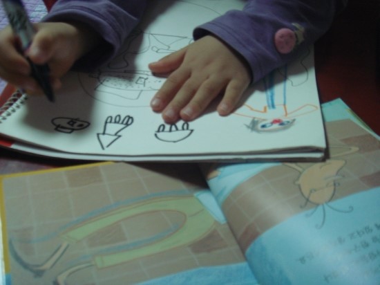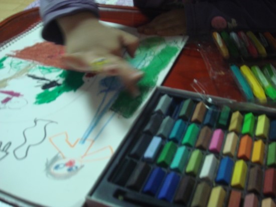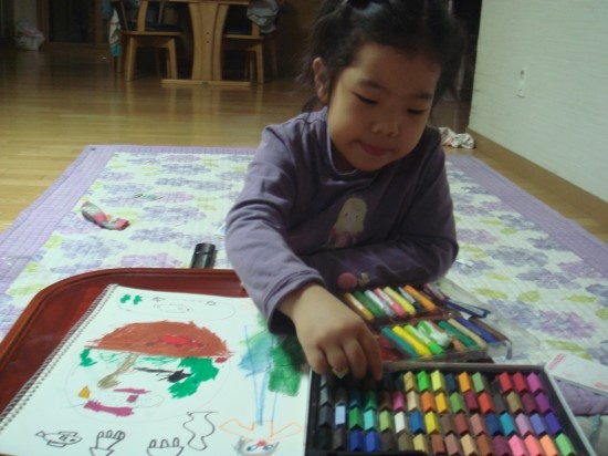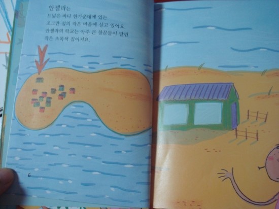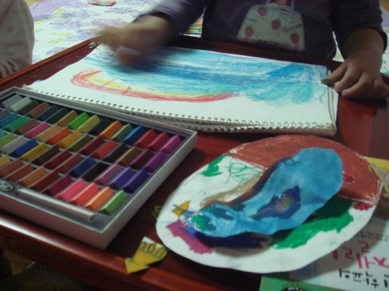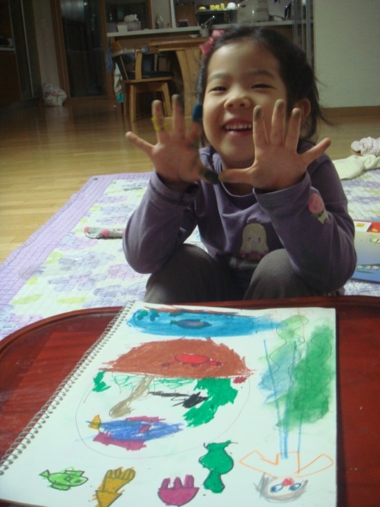 후루룩 뚝딱 읽기 그림책 1단계 - 해변 학교의 안젤라 아이의 완소책이 되어서 여러번 읽고나자, 책의 첫페이지에 나오는 파란 바다를 그려보고 싶다고 했습니다. 연필로 그리기 싫다고 해서 싸인펜으로 밑그림을 그려보았습니다. 동그란 바다에 물고기와 미역도 그리고 옆에는 피터선생님 같기도 하고.. 바다를 이렇게 까지 좋아하는줄 몰랐습니다. 책을 옆에다 펴놓고 어려워하는 그림은 찾아가면서 보고 그리기도 하였습니다. 얇은 싸인펜으로 그리다가 좀더 두꺼운 유성펜으로도 그렸습니다. 더 멋지게 그려진다고 하네요^^ 다양한 물고기들을 별로 그려본적이 없어서 어려워했지만 생각하는대로 그려보라고 격려했습니다. 크레파스로 색을 칠하고 좀더 색다른게 없을까 찾아보다가 미리 사두었던 파스텔을 꺼내주니 무척 좋아했습니다. 파스텔을 처음 사용해 보기때문에 손에 묻는 것을 신기해했습니다. 아이에게 '안젤라 책이 왜 그렇게 좋아?' 하고 물어보았더니 '음 나도 학교에 가고 싶은데 안젤라는 바다에 있는 멋진 학교에 다니고 마음대로 신나게 뛰어놀고 하니까 나도 안젤라처럼 그렇게 하고 싶어요' 라는 대답에서 아이가 자연속에서 좀더 자유롭게 놀고 싶어한다는 마음을 느낄수 있었습니다. 면적이 넓은 부분은 파스텔을 칠하고 손으로 문질러 보았습니다. 가루가 떨어져 날리기도 했지만 아이가 무척 재미있어했습니다. 아이들과 격의없이 친구처럼 지낸 피터선생님같은 엄마가 되야겠다는 생각이 들었고 집안에서 많은 시간을 보내는 아이를 위해 '뭘 함께 해보면 좋을까?' 란 생각도 해보게 되네요. '으악~ 엄마, 제손좀 보세요' 마냥 신이나 했습니다.