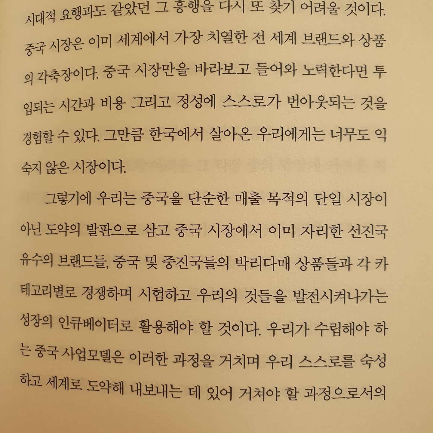 더 이상은 중국이라는 국가가 인건비가 싸고 판매루트가 다양하며, 쉽게 돈을 버는 시장이라고 생각하는 분을 없을 겁니다. 대도시의 인건비는 이미 우리나라를 추월했고 부동산가격과 임대료는 말할 것도 없지요. 중국이 외자유치와 합작회사의 형태로 개방을 한지도 20년이 지났고 너무나 많은 것이 변했습니다. 이미 5년전에 한국보다 디지털 분야에서는 더 빠른 인프라를 보유하기도 했고, 국내보다 훨씬 많은 범위의 미래산업이 육성되고 있습니다. 한가지 분명한 것은 여전히 거대인구를 기반으로 빠른 변화에 대한 갈증을 가지고 있는 잠재소비력이 높은 국가라는 사실이죠. 국내 게임회사들이 ‘판호’에 목숨을 거는것도 이유가 있습니다.  예전보다 훨씬 난이도가 높아진 현재 중국에서의 비즈니스를 어떻게 해야하는지 <중국을 이기는 비즈니스 게임>을 읽으면서 많은 생각이 드는 건 너무나 당연한 일입니다.