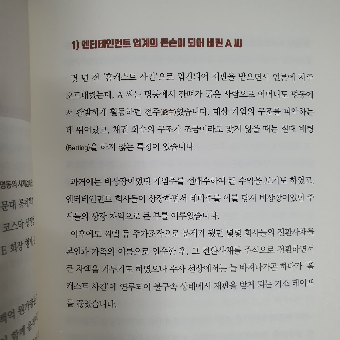 본서는 주주운동을 하며 삽심년간 주식시장에서도 주가조작 사건에 대해 많은 조사를 벌였던 제보자 X라는 분이 그간 본인의 경험과 함께 많은 제보자들을 통해 받은 내용들을 엮어서 정리한 서적입니다. 무자본 M&A를 시작으로 가상화폐주가조작, 라임펀드사태, 악의 공매도 세력, 기업사채시작과 하락형 상승형 주가조작에 대한 내용 청담동 주식부자 이희진씨의 내용까지 많은 세력투기꾼들의 사례들이 나와있어, 겉으로 보이는 주식시장의 이면에 존재하는 수많은 비하인드 스토리들은 왠만한 투자소설보다 훨씬 재밌습니다. 게다가 본서에 등장하는 많은 내용들이 허구가 아니고 실제로 일어난 사실들을 담고 있기에 그것이 일어난 일들에 대한 연유를 살펴가면 대한민국의 부조리한 구조를 파혜쳐가는 과정을 간접체험할 수 있습니다.