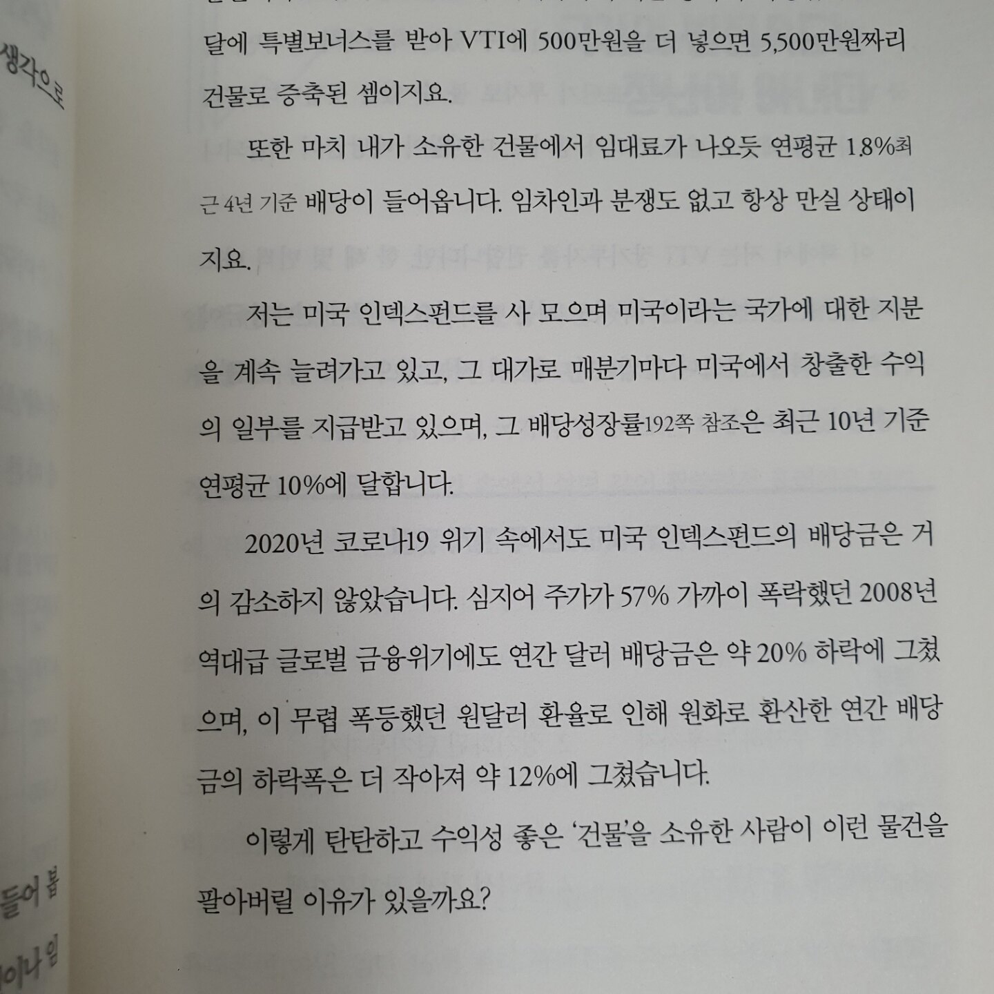 물론, 본서의 내용이 정답은 아니며 향후 VTI같은 인덱스펀드가 어떻게 변할지는 아무도 모릅니다. 또한 투자자로서 저는 저자분과는 다른 저만의 투자방법으로 미국주식에 투자하지만, 안정적이면서도 투자공부에 시간할애를 하거나 리스크테이킹이 두려운 분들께서는 VTI같인 지수추종을 하면서 운용보수가 낮고 배당을 주는 ETF는 어찌보면 선택범위중에 상당한 우월전략이라고 생각합니다. 다만 어디까지나 이는 저의 개인적인 생각일 뿐입니다. 본서를 통해 VTI에 대한 저자의 논리를 이해해보시고 과연 이것이 적합한 방법인지를 검토해보면 한단계 나은 투자자로서의 발걸음이 시작될거라고 봅니다.