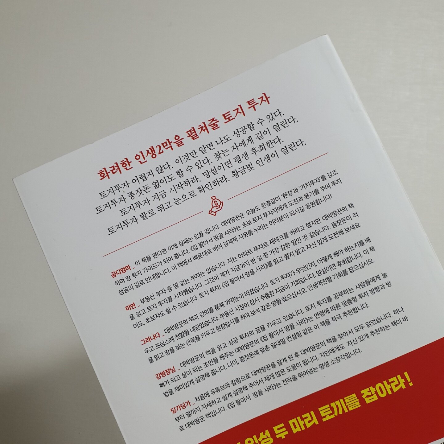 제 개인적으로는 주식투자를 잘하면서 공동주택 투자를 잘하는 사람은 보았되 그 역순을 보긴 쉽지 않지만, 땅 투자를 잘하는 분들은 주식투자도 잘하는 분들이 많았습니다. 그 이유는 두가지 투자법의 접근 방식이 유사하기 때문입니다. 수많은 요소들을 분석하고, 변화의 흐름을 감지하고, 남들이 무관심할 때 보다 저렴한 가격에 매입해, 개발이 될 시간을 인내하면서 자기가 가지고 있는 투자노하우를 업그레이드 하면서 꾸준히 현장을 확인하는 방식이죠. <대박땅꾼…>은 그동안 보았던 10권에 가까운 땅투자서적중에서도 모든 분들께 추천하고 싶은 서적입니다.