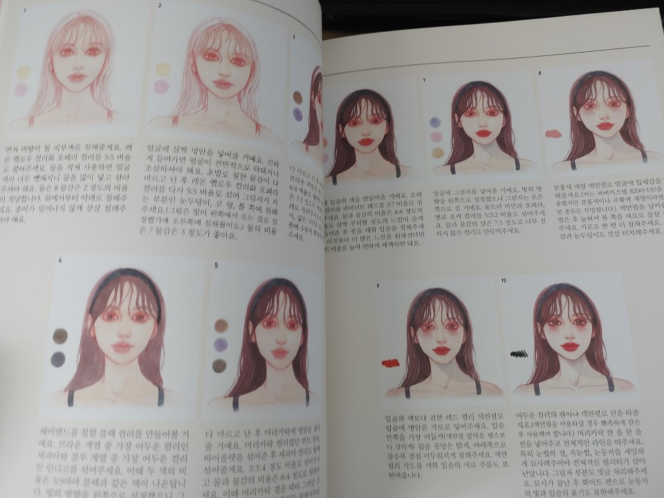 처음에는 사람 눈그리는 것부터 시작해서 코 입까지. 거기다가 화장하는 팁을 색연필과 수채화 별로 알려줘요. 수채화 책이라고 해서 마카도 될 줄 알았는데, 마카는 뒤에 번지더라고요. 혹시나 해서 맨뒤에 있는 장을 색칠 조금만 해보았답니다. 그랬더니 뒤에 번지더라고요. 이사하는 바람에 수채화 도구가 없어서… 해보지는 않았지만 마카는 안 되는 책인 걸로.