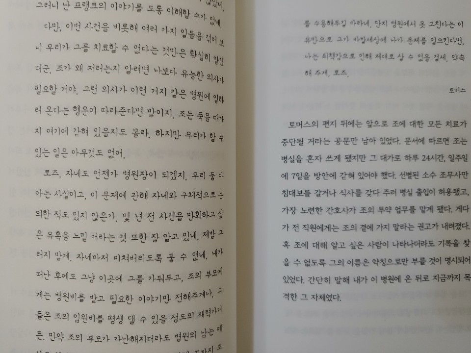 책의 몇몇 구절이 작가의 성격을 나타내는 것 같았다. 자선가, 어떤 말로는 오지랖, 내가 생각엔 오지랖이 더 큰 것 같기도 하다. 주인공 파커는 그 환자를 변화시키는 게 자신의 임무라고 생각한다. 그 환자를 조라고 불린다. 정식 이름도 있을 테지만 어느 날부터 그렇게 불렸다고 한다. 흥미반 관심반이었던 파커는 나이 든 간호사 네시의 말림에도 불구하고 호기심이 이끄는 대로 조사하기로 시작한다. 기록실에 남은 일기장.