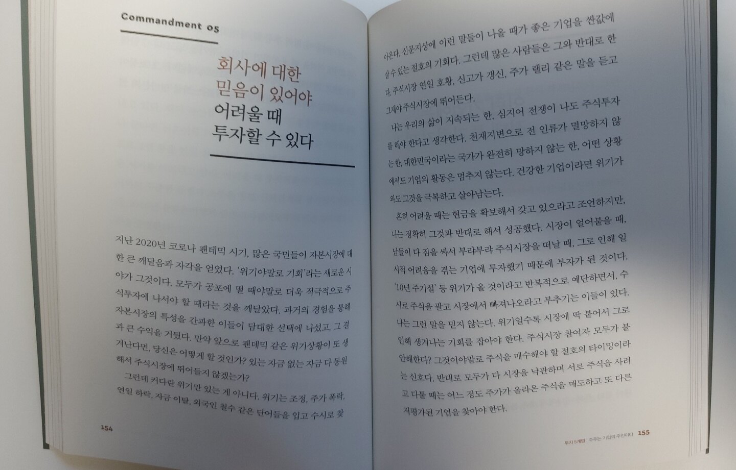 책에서 말하는 주식투자의 원칙은 10개의 장에 걸쳐 각각의 중요한 실천 사항들을 설명하고 있다. 그리고 각 장마다 세부적인 원칙들을 이야기하며 개인투자자들이 무엇을 중점으로 투자를 진행하며 무엇을 주의해야 하는지 투자자로서 지켜야 하는 핵심적인 원칙을 말하고 있다. 주식투자의 대가가 쓴 책답게 장기적인 안목으로 투자를 진행할 때 중요한 투자의 원칙이 오롯이 담겨있기 때문에 개인투자자가 투자의 기본을 다지는 데 많은 유익을 준다.