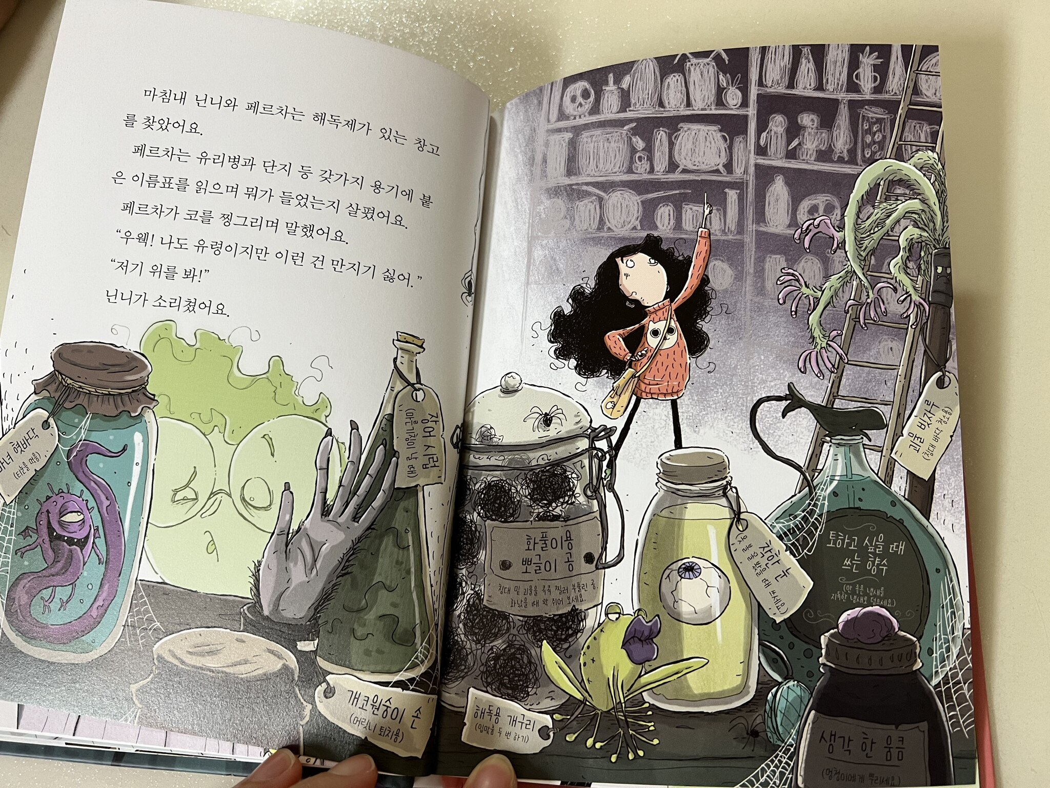 용간한 소녀와 어설픈 유령이 펼치는 짜릿한 모험과 도전! 악몽가게인만큼 다양한 물건들 보는 재미가 있더라고요. 화풀이용 뽀글이 공, 마녀혓바닥, 생각한움큼 등등..ㅋㅋㅋ 그림도 재밌고 글에서도 자세히보면 악몽가게답게 피처럼 무서운 글씨효과가 들어간 문구들이 있어서 아이가 이부분을 엄청 재밌어하더라고요.