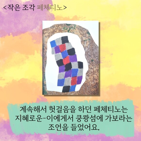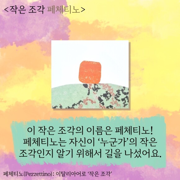 이 작은 조각의 이름은 페체티노! 페체티노는 자신이 ‘누군가’의 작은 조각인지 알기 위해서 길을 나섰어요.