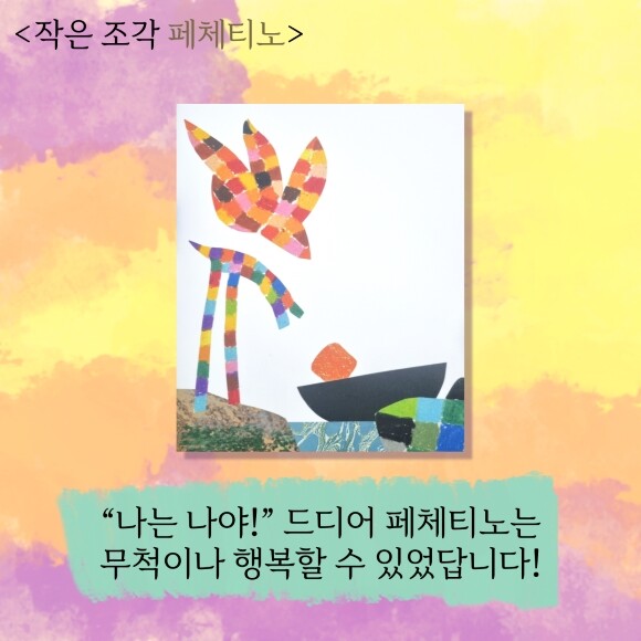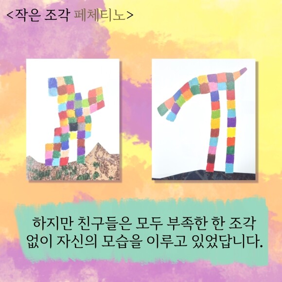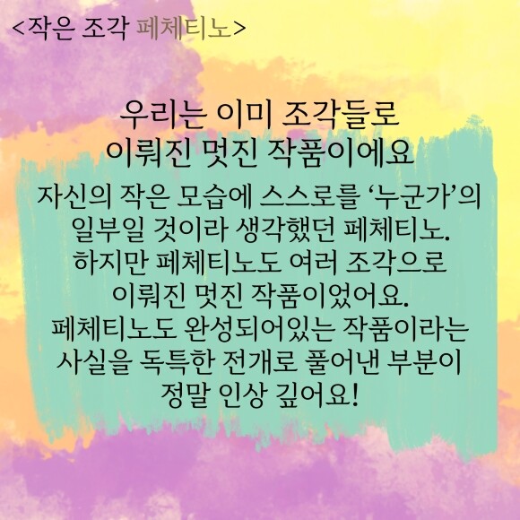자신의 작은 모습에 스스로 ‘누군가’의 일부일 것이라 생각했던 페체티노. 하지만 페체티노도 여러 조각으로 이뤄진 멋진 작품이었어요! 페체티노도 완성되어있는 작품이라는 사실을 독특한 전개로 풀어낸 부분이 정말 인상깊어요!
