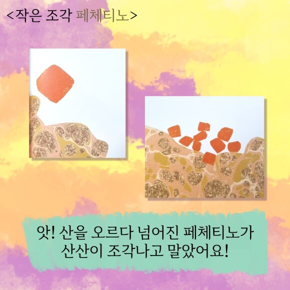 앗! 산을 오르다 넘어진 페체티노가 산산이 조각나고 말았어요!