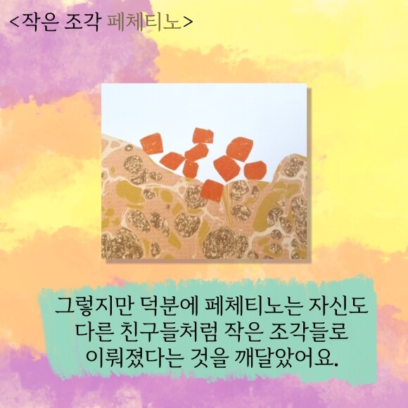 그렇지만 덕분에 페체티노는 자신도 다른 친구들처럼 작은 조각들로 이뤄졌다는 것을 꺠달았어요.