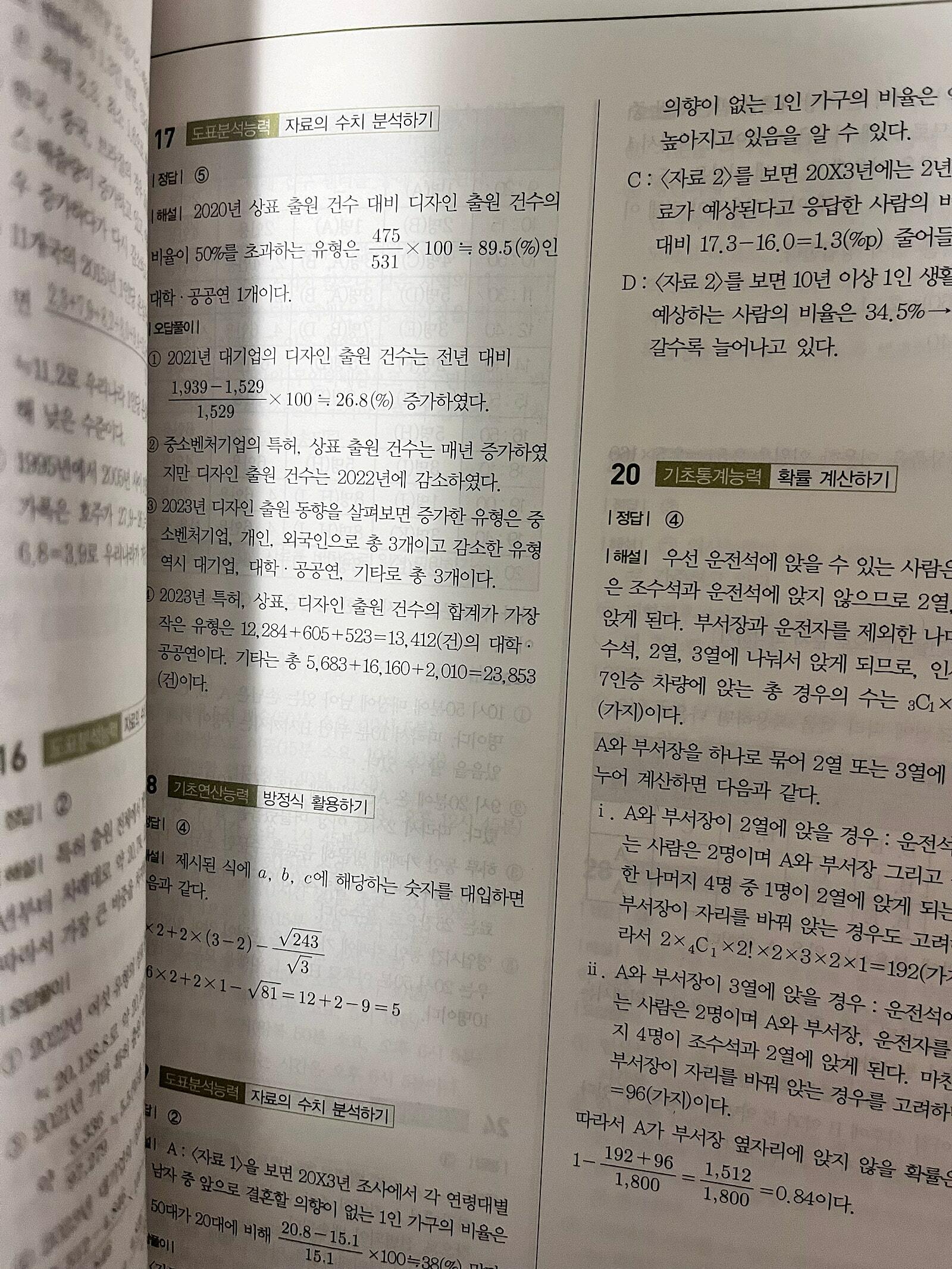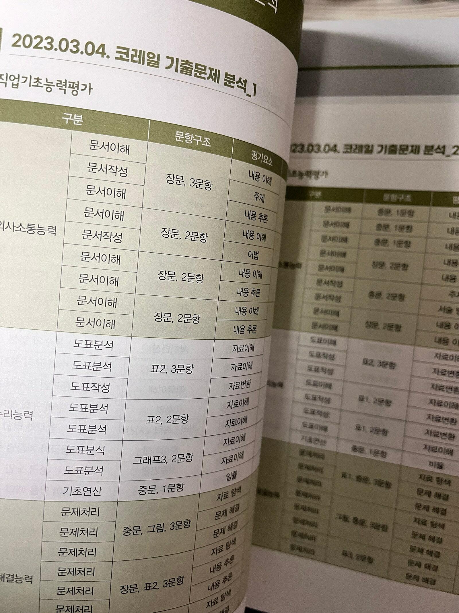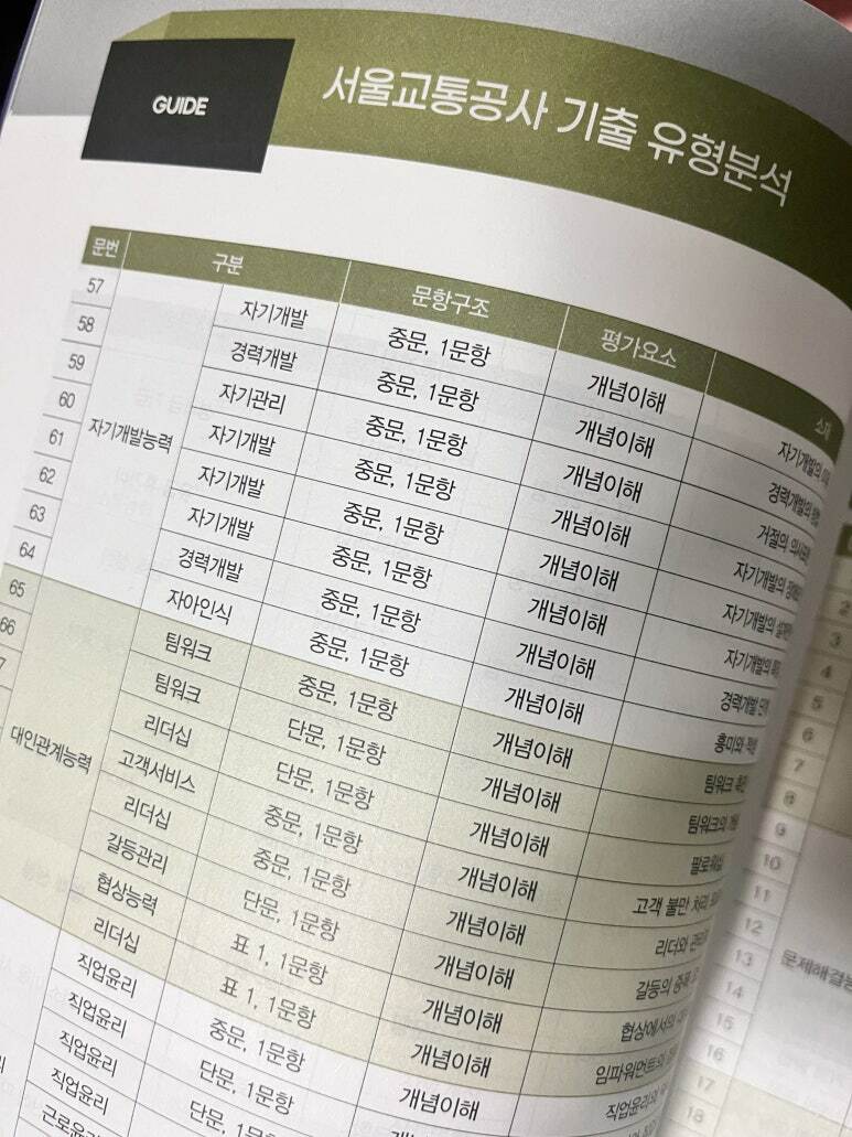 특히 서울교통공사는 직무능력평가 10개영역을 모두 시험문제로 출제하고 있습니다. 의사소통, 수리, 문제해결, 자원관리, 조직이해, 정보, 직업윤리 등 많은 영역을 공부해서 대비해야해서 여러 교재들을 참고해야하는 번거로움이 있습니다. 하지만 고시넷 교재는 한회에 모든 영역을 포함하고있어 모든영역의 모의고사를 무려 8번이나 풀어볼 수 있습니다. 또한 올초에 시행된 시험(2024.01.20)과 작년시험(2023.06.24)의 기출유형분석도 수록되어 있어 최신유형 파악도 가능합니다.