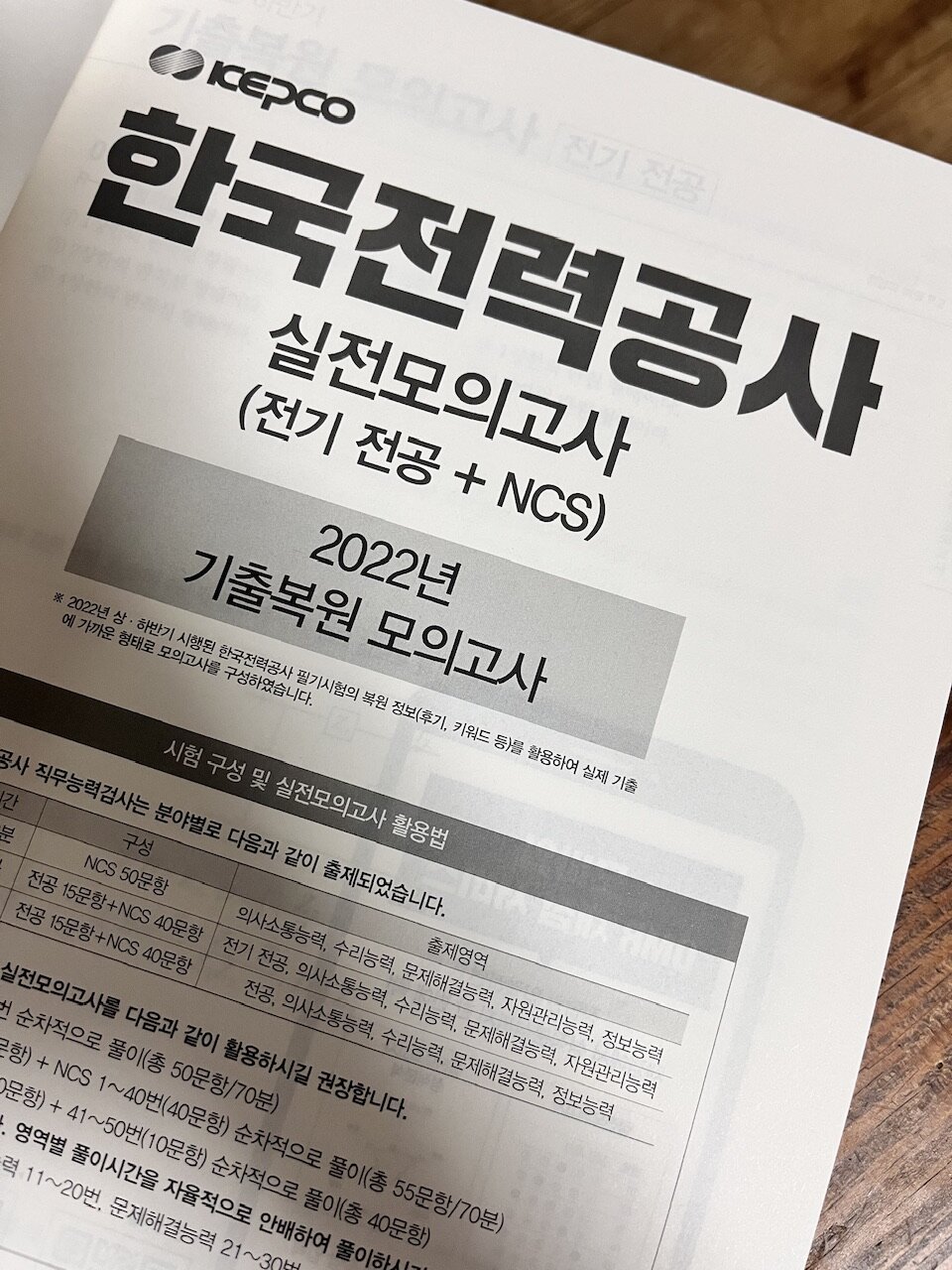 교재는 NCS 5회, 전공(사무,전기) 4회가 수록되어 있습니다. 책 구성도 실제 모의고사처럼 되어 있어 실전 연습용으로 좋을 것 같습니다. 해설부분도 상세하게 설명되어 있어 틀린문제를 체크하는데 도움이 될 것입니다. 또한, 모바일 OMR 채점 서비스도 이용할 수 있어 성적 분석 서비스로 부족한 파트를 보완할 수 있는 점이 장점이라 생각합니다.