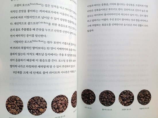 생두를 채취해 원두로 만드는 과정도 여러 공법이 있었다. 그저 말리는게 아니였던 것이다. 이 원두에도 종류가 다양해서 커피를 좋아하는 분들에겐 정말 좋은 정보가 아닐까 싶다. 게다가 어떻게 보면 바리스타 자격증을 딸때 나올것 같은 전문적인 용어나 지식 등을 이렇게 만나볼 수 있다는 점도 좋다고 생각한다. 너무 딱딱하지 않게 쓰여져서 흥미차원에서 읽지만 충분히 깊이 있는 정보도 얻을 수 있기 때문이다.
