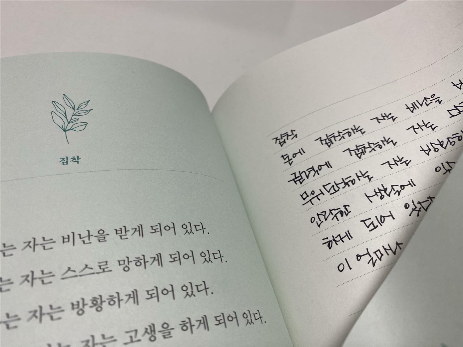 + 출판사: 지은이: 사진1 사진2 각 주제에 맞는 이야기들이 있어서 내가 어떤 감정을 다스리고 어떤 부분에 위로를 받아야 하는지 그 필요한 주제에 맞춰 먼저 필사를 하면 된다. 원문과 필사를 할 공간뿐만 아니라 그 주제에 대한 글도 함께 있어서 먼저 쭉~ 읽어보면서 마음에 새겨보며 시작하기가 좋은 필사책이다. 어느 순간부터 필사를 하면서 마음을 내려놓기도 하고 위로를 받기도 했다. 끝없는 생각의 꼬리들을 잘라내기도 좋고 무수한 뒤죽박죽의 생각들을 정리하면서 오롯하게 나만을 생각하기도 좋은 시간이라 필사는 최애의 스트레스를 해소하는 방법이 되었다. 사진3 사진4 사진5 내 마음을 괴롭히는 ‘집착’은 무수한 불면의 시간과 그 많은 생각의 꼬리들을 덧대고 이어나갔다. 끊어버려야 나도 자유로워지는 걸 알면서도 잘 안되었던 것은 내 안의 집착때문이었겠지. 집착과 미련의 그 굴레에서 무한반복하고 있는 집착을 글을 따라쓰면서 하나둘씩 제거 중이다. 글씨가 예쁘지 않아도 굳이 잉크의 스며드는 느낌이 없는 연필이라도 내 마음 고스란히 담아볼 수 있는 필사만의 매력이란!!!! 빠져보면 헤어나올 수 없다.