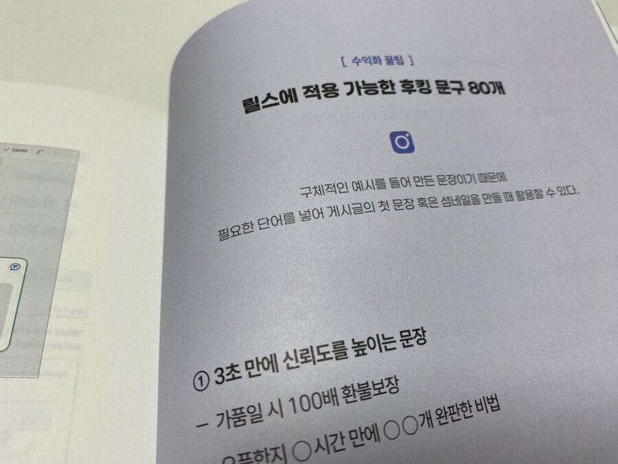 + 출판사: 매일 경제 신문사 지은이: 최지혜 사진1 사진2 인스타그램으로 수익을 창출한다는 것이 늘 궁금했던 나는 계정도 개설하고 여러가지 기증도 익히는 중이지만 블로그 포스팅에 익숙해서인지 여전히 낯설다. 비단 인스타로 수익을 창출하는 단순한 로직뿐만이 아닌 샹활 전반적인 면에서 나의 경제적 사고를 되돌아 볼 수 있는 시간이었다. 사진3 사장 중요한 포인트는 ‘전환률을 높이는 프로필’ 인스타그램은 글자 수 제한이 있기에 한 줄 안에 간결하고 명료하게 작성하는 것이 중요!!! 프로필은 팔로워로 전환이 될 때 가장 영향을 미치는 부분이라 한다. 세부적인 타깃을 정해야하는 이유다. 가령 살림 노하우의 계정이라면 간단히 살림 노하우보다는 ‘딸맘이 전하는 예쁜 살림 노하우’ 다이어트 계정이라면 ‘5분 만에 끝나는 초간단 다욧 래시피 공유’등 무심결에 지나가도 쉽게 기억할 수 있는 이런 재치있는 계정짓기부터가 결국 수익 창출의 시작이라 보면 되겠다.. 사진4 요즘 릴스같은 몇 초 안에 강한 인상을 심어주는 영상들이 매력적인데 이것 역시 그냥 만들어지는 것은 아니었다. 3초 만에 신뢰도를 높이는 문장 공감대를 형성시키는 문장 한 번 더 정리하여 각인시키는 문장 이득을 강조하는 문장 무조건 믿게 만드는 확신의 문장 반전을 주어 흥미를 유도하는 문장 등 반복 재생하게 되는 영상이라 간결하게 각인하게되는 이런 문구를 사용하는 것이 역시 관건이라 하겠다. + 인스타그램의 계정부터 릴스 문구까지 구체적 사례까지 꼼꼼하게 보여주고 있어서 ‘나도 가능할까?’ 늘 의구심이 들어었던 영역이었는데 이제 조금씩 시도해봐야겠다.