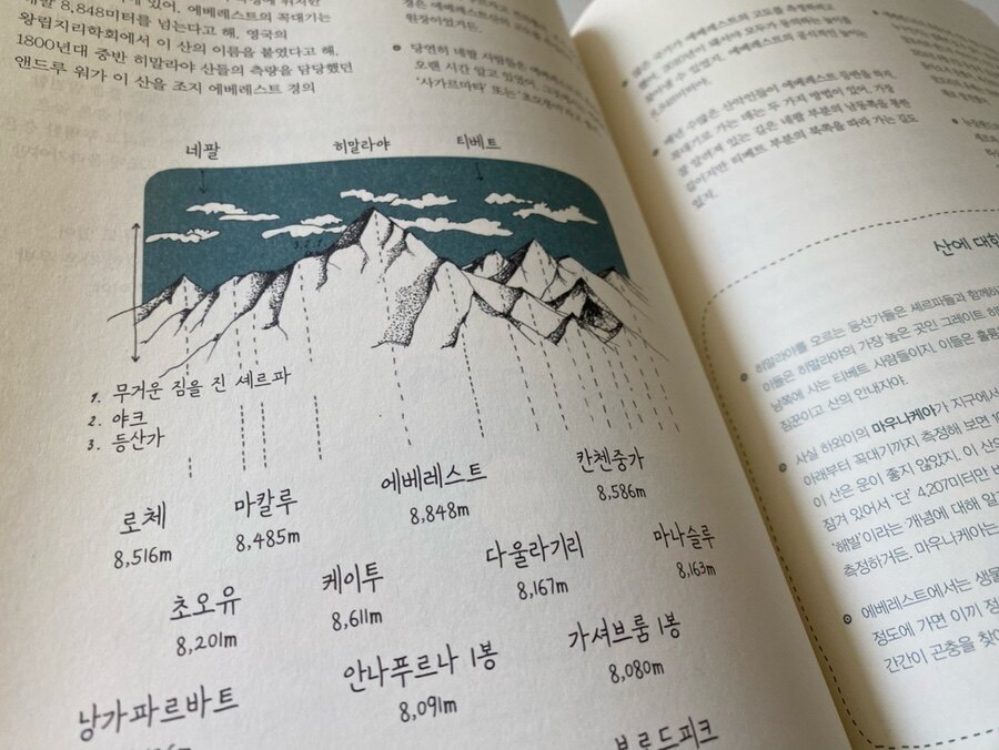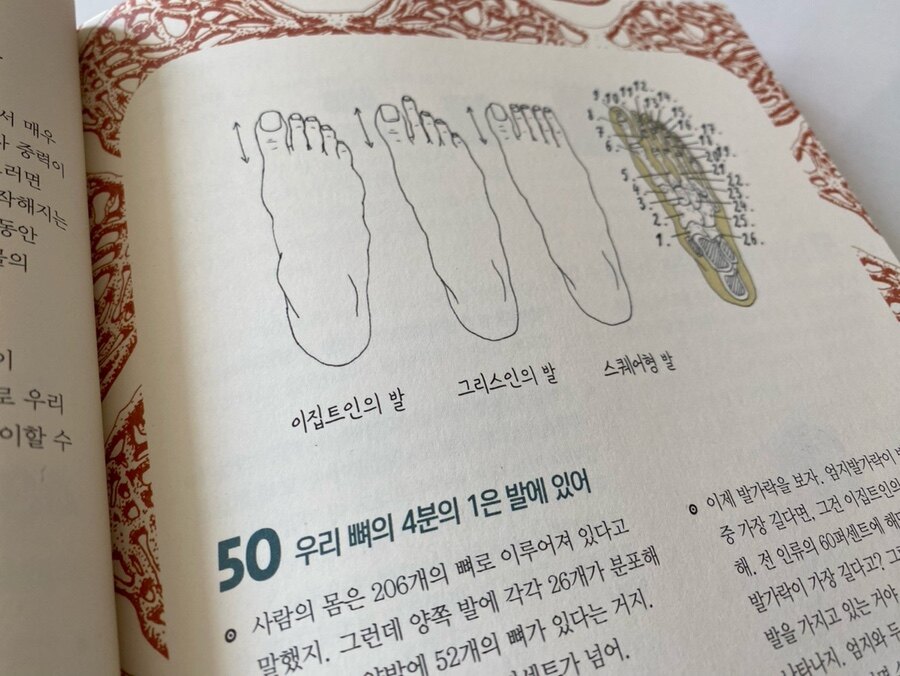+ 출판사: 그린북 긍: 마틸다 마스터르스 그림: 라우이저 페르디위스 옮긴이: 최진영 사진1 이런 책~ 정말 매력적인데!!! <순서> 놀라운 동물의 세계. 알수록 신비한 인체. 스포츠의 세계 유명한 인물 이야기. 뜻밖의 세계사 상식. 아름다운 별 지구. 신나는 세계 여행. 재밌는 과학의 세계 다양한 지구의 말과 언어. 신기한 식물의 세계. 음식에 관한 모든 것. 상상초월 별들의 세계 이렇게 총 12가지 대분류로 되어있다. 과학 그리고 인문의 이야기들을 총망라했기때문에 무척 매력적인 책이다. 사진2 사진3 - 우리 뼈의 1/4은 발에 있어- 사람의 몸은 206개의 뼈로 이루어져 있고 양쪽 발에 각각 26개가 분포 즉 52개의 뼈가 있가. 우리 전체 뼈의 15%가 발에 있다. 뼈를 다 둘러보았다면 엄지 발가락을 살펴보면 또 신기한 이야기가 담겨있다. 내 발 모양은 ‘그리스인의 발’이다. 엄지발가락이 발가락이 가장 길다면 이집트인의 발이라고 한다. 전 인류의 60%가 그리스인의 발모양이라고 한다. 난 그리스인인데!!! 사진4 사진5 -구름으로 뒤덮인 지구에서 가장 높은 산꼭대기- 에베레스트산은 세상애서 가장 높은 산이라는 것은 누구나 잘 알고 있는 사실! 네팔과 티베트의 국경에 위치한 히말라야 산맥이 있다. 이 산의 이름이 왜 에베레스트인지에 대해선 생각해본적 없었는데 여기 나오있다. 1800년대 중반 히말라야 산들의 측량으루담당했던 앤드류 워가 이 산을 조지 에베레스트 경의 이름을 따서 부르자고 했다고 한다. 애베레스트산의 고도를 측정하던 교육원 원장이라고 한다. 얼마나 영관스러울까!!! 그리고 또 더 많은 산에 대한 이야기는 애배레스트산에 많은 쓰래기를 버리고 돌아가는 등산가들이 있다고 한다. 네팔의 등산가 새르파는 수천 kg의 쓰레기를 채집하기위해 등산을 계획하기도 했다고 하니 놀랍다. + 겨울방학동안 나의 배경지식을 넓혀 줄 아름다운 책 두껍지만 결코 두껍다고 느껴지지 않는 책!!! 궁금한 이야기들이 가득 들어있는 책의 두께가 얇다면 오히려 많이 서운했을듯!!!! 알고있는 이야기들은 내가 제대로 알고있었는지 확인하며 읽어가고 새롭게 알게된 이야기들은 ‘이런 일이 있었구나!’ 감탄하며 읽어내려가는 재미가 가득한 책!!!