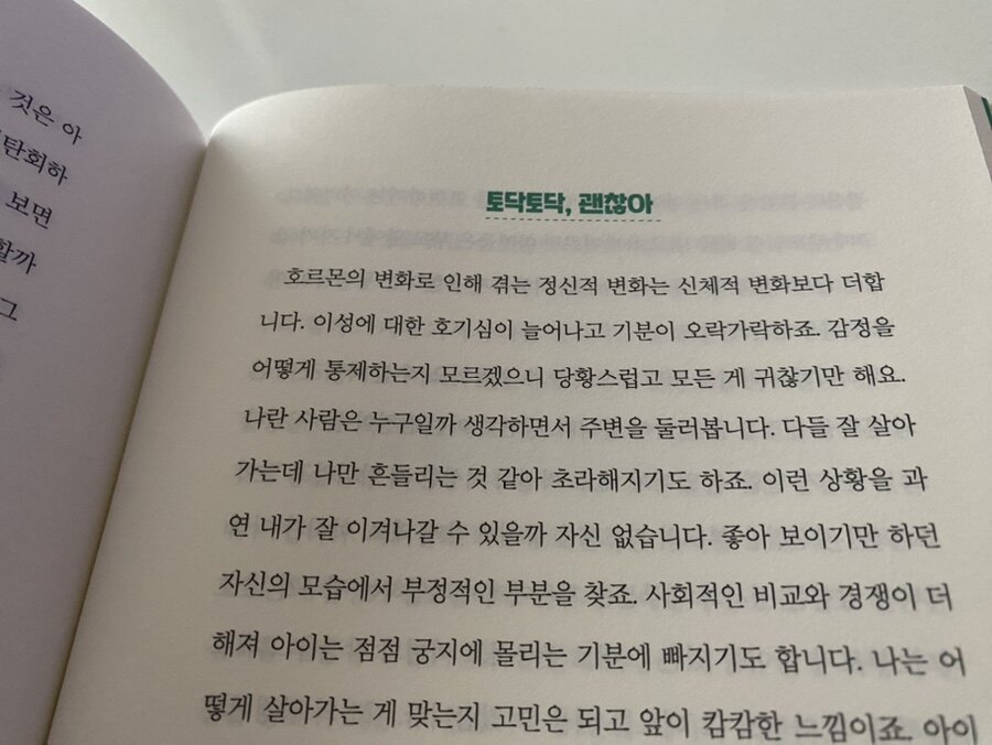+ 출판사: 더블북 지은이: 이현주 . 이현욱 사진1 사진2 사춘기 & 갱년기 이 시점이 묘하게 붙어있다. 아이들 사춘기가 무르익을 때 나의 갱년기도 꽃을 피우기 시잗했으니말이다. 너무나 오래 전에 겪은 나의 사춘기를 미처 떠올려보기도 전에 아이들의 사춘기는 그렇게 시작되었고 단지 말대답이 좀 심하네!!’쯤으로 여겼던 나의 생각이 알고봤더ㅣ 착각이었던 것!! 사춘기는 호르몬의 변화로 오지만 그 표현법은 우리집의 경우 ‘입’이었다. 늘어지는 말대답에 미쳐버릴 것만 같았던 시간들이 벌써 여러 해!!! 사춘기라고 온갖 진상짓을 하지않아도 사춘기라는 건 누구나 다 알아주는데 굳이 티를 내면서 염장을 지르고 뒷목 잡게 한 아이들!!! + 진작 이 책이 나왔더라면 내가 아이들을 이해하는데 좀 더 도움이 되넜을거라 생각한다. 서로의 무지로 인해 많이 힘들었으니까!!! 사진3 사진4 사진5 사춘기는 정서적으로 안정된 상태에서 무난하게 크게 상처받지도 주디도 않아야된다는 것을 이 책을 통해 한 번 더 숙지하게 되었다. 하지만 이론과 실제는 늘 그렇듯 괴리감이 있어서 안타깝기는 하다. 우리 아이들은 사춘기없이 무난히 지나가는 줄 알았는데 그건 아니란 사실!!! 누구나 겪는 인생의 과정이기에 그 안에서 현명하게 다처해가는 방법을 찾는 것이 가장 중요한 해결책이다. 나처럼 준비없이 무턱대고 우리 아이들은 사춘기가 없어!!라는 근거없는 확신보다는 책이나 전문가의 도움은 꼭!!! 필요하단 것!!!! 일찍 마음의 준비를 해야 당황스럽지 않고 행복한 사춘기를 아이와 함께 보낼 수 있다. 그런 마음에 위안과 대책을 함께 세워볼 수 있게 도와주는 책 한 권!!!