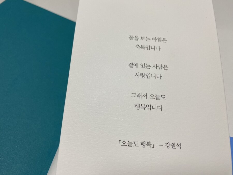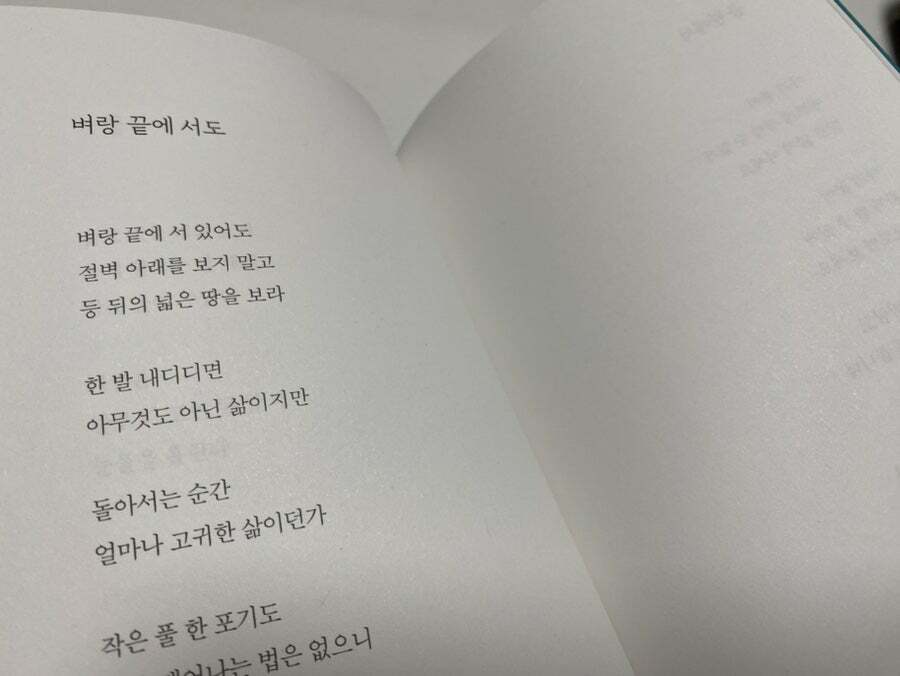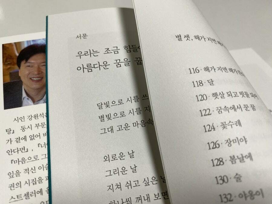 + 출판사: 구민사 지은이: 강원석 사진1 사진2 시는 지금 나의 상태에 맞게 순서 상관없이 그 때그 때 찾아 읽으면 된다. 지금 나의 상태는 절망과 위로의 매 순간 반복이기에 그런 나의 감정에 맞는 시들로 먼저 감상했다. 어렵지 않아서 좋았고 쉽게 공감할 수 있어서 더 좋았다. 사진3 사진4 그리고 가장 좋았던 점은 시 바로 옆 페이지의 여백이었다. 시의 여운이 여백에 그대로 내려앉았다. 시는 그런 것이 아닐까? 함축된 시어 하나에 많은 뜻을 담고있어야하니 시를 천천히 읽은 후 그 감동을 조금은 추스려야하니말이다. + 한 행 한 행 어렵지 않게 읽어내려간 시행 이렇게 쉽고 아름다우니 많은 가수들에게 노래로 불리지않았을까!!! 변진섭. 조성모. 추가열. 태진아. 윤복희 등 노래로 부르고 드라마 OST의 가사로도 사용된 강원석 시인의 시들!!! 동시대를 살아가고 그들의 노래에 가슴이 움직였던 나로서는 참 벅찬 감회가 느껴진다. 인생의 변곡점마다 그리고 터닝포인트들마다 한 편씩 아껴가며 읽어약겠다. 그리고 난 후 여백에 필사를 해도 좋을 책이다.