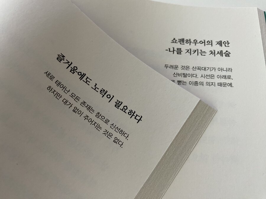 + 출판사: 파랑새 서재 편역: 김미조 사진1 사진2 올해 나의 목표는 인문학과 친해지기!!! 인문학은 사람이 살아가는데 필요한 다양한 경험치를 쌓아가도록 해주고 읽을수록 똑똑한 나를 만들어주는 느낌이라 꼭 친해져야하는 친구라고 생각한다. 생각은 그러한데 사실 쉽지 않아서 늘 진지한 고민!!! 그 첫 친구로 쇼펜하우어!! 얼마나 유명한 사람인지는 이미 주워들어 알고는 있지만 막상 접하는 것은 처음이라 살짝 설레고 많은 기대를 해본다. 사진3 사진4 짧지만 많은 의미를 담고있는 이런 글귀 하나하나가 삶의 방향성을 잃고 헤매는 나애개는 무척 많은 도움이 된다. 그 함축된 의미를 찾아가며 내 인생의 방향을 다시 찾아 나서는 길이 바로 책이 주는 매력이라 생각하니까!!! 사진5 어제도 오늘도 삶에 치이고 사람들에게 치여 속상한 나의 마음에 시원한 맥 주 한 잔의 상쾌함을 고스란히 전해준다. 내가 가고있는 길이 맞는지 중간에 잠시 한 눈을 팔고 있었던 것은 아니었는지 스그로 돌아보게 하는 힘!!!