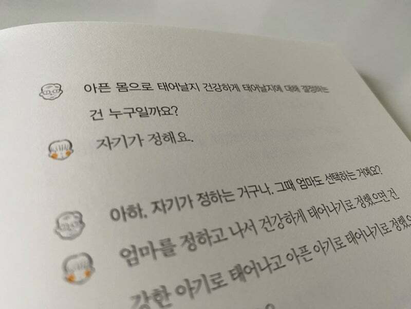 + 출판사: 시월의책 지은이: 이케가와 아키라 그림: 정원채 옮긴이: 이서은 #시월의책 #정원채 #이서은 #엄마를사랑해서태어났어 #탄생과죽음은같은공간에서 #아이들의마음이느껴지는따뜻한책 사진1 사진2 우리집 청소년들 사춘기의 정점인가 싶다가도 이건 사춘기가 아닌 엄마에 대한 반항인가? 싶기도… 결국 같은 말인가?!!! 요즘 우리집 청소년들은, 툭~하면 시비걸고, 말꼬리 잡고 늘어지고, 훈육이란 이름으로 내가 받는 스트레스가 극에 달하고 있다. 우연히 보게 된 이 책 <엄마를 사랑해서 태어났어> 제목이 무척 사랑스러워서 선택한 책이었다. 내용은 더 놀라운 책인데~ ‘거의 모든 사람들이 탄생의 기억에 대해 알고있는 듯’ 우리집 청소년들에겐 들은 기억은 예나지금이나 없었고 나 역시도 그런 말을 해보거나 들은 적이 없어서… 태어날 때의 기억을 아이가 말을 배우고 표현을 할 무렵이 돼야 부모에게 전달했을테니까 그럼 적어도 태어나 1-2년은 그 순간의 기억을 곱게 간직하고 있었단건데 그 사실이 더 놀랍다. 우리집 청소년들은 아무 생각이 없었구나… 사진3 사진4 태어나기 던 아이들이 천사들과 구름 위에서 엄마를 선택하기 전 경험하는 다양한 이야기들~ Q: 아픈 몸으로 태어날지 건강하게 태어날지에 대해 결정하는건 누구일까요? A: 자기가 정해요. 난 이 부분에서 마음이 좀 울컥했다. 우리집 청소년 A도 태어나서 한 달만에 시작한 병원 생활이 지금까지 이어지고 있는데 왜 우리 아이는 아픈 몸으로 태어나는 것을 선책했는지 모르겠다. 건강하게 잘 자라는 것을 선택하지…. 그리고 해당 아이의 인터뷰가 끝나면 아이의 엄마의 한 마디가 것부터 덧붙여져있는데 아이 말과 연관성이 있어서 놀라웠다. + 아이의 선택 그리고 아기들은 다양한 곳에 도움이 되기 위해 태어나는 듯 하다고 한다. 유산되는 아기들은 생명의 소중함 같은 걸 알리고 싶어서 간다고 한다. 태어나기 전 아직 엄마 배 속에 안 들어갔을 때 옴마 뒤를 날아디니면서 엄마를 지켜 줬다고 한다. + 아기들이 엄마로 날아가기까지 있었던 이야기들이 귀엽기도 하지만 가슴 뭉클해서 더 매력적이었다.