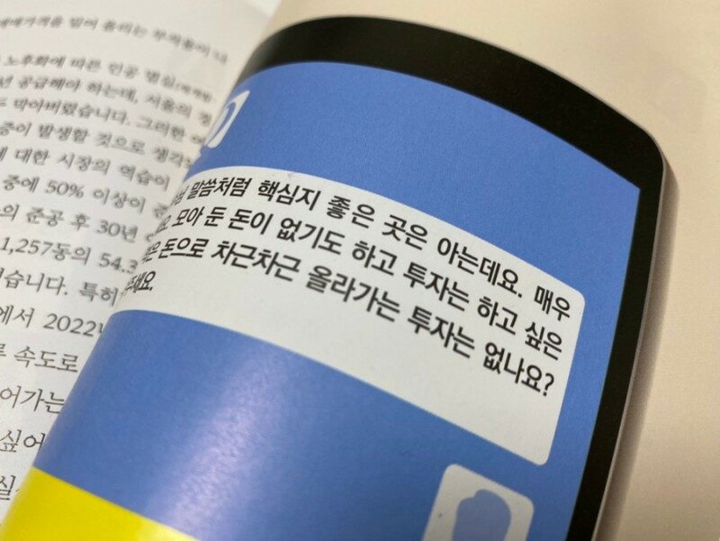 + 출판사: 두드림미디어 지은이: 구만수 #두드림미디어 #누구나알고싶어하는아파트투자방법 #구만수부동산TV #부린이도쉽게공부해는부동산 #부동산투자 #아파트투자 #핵심지매매 사진1 사진2 평생 부동산에 대한 생각도 주식에 대한 개념도 모르면서 살아왔다. 그러던 어느 날 내가 정말 바보로 살았구나라는 것을 깨달았을 때는 손에 쥐고 있는 것이 없었다. 그 후 많은 채널을 통해 이것저것 주워 들은 것이 쌓여가고 이젠 정말 제대로 공부를 해야겠다는 생각이 들었다. 부동산을 공부하면 경제가 보인다는 사실을 그동안 나만 몰랐다. 이러니 당하고 속고… 그렇게 살아왔지… 현타가 오는 순간이었다. + 사진3 이 책은 지은이가 실제 질문 받은 내용들로 구성!!! 그동안 내가 궁금했던 내용들이 들어있어서 비현실적인 이야기가 아닌 란 점이 좋았다. (포스팅중, 잠시 올려두었던 글에도 이리 많은 클릭 수가 나오는 걸 보면 역시 그동안 나만 몰랐던 관심사였어) + <책> 1. 마인드셋- 왜 투자를 하려고 하는지!! 2.인플레이션이 대한 공부는 필수!! 3. 우리나라 부동산에 관한 책 : 결국 정치인을 공부해야한다는 것! 정권이 바뀔 때마다 정책이 바뀌고 그 정책에 따라 부동산 시장의 흐름이 바뀜 <지인> 주변 지인을 통한 정보 이럴 경우 지인이 어떤 사람인지 파악이 돼야한다는 전제 그 지인의 정체 파악 <일단 매매> 일단 지르고 공부 시작 이 경우는 상당히 비효율적 <경매 학원> 사면 수익을 볼 수 있는 그렇기 좋은 투자 물건이 쉽게 나오지 않는다는 사실 <유투브> 유투버 본인의 투자에 대한 계약서와 세금까지 전부 오픈한다면 신뢰하고 믿을 수 있지만 항상 관심을 가지며 관찰 부동산 전반의 흐름. 지역 호재. 시장의 분위기를 탐색하는 수준의 영상은 상당히 도움이 됨!! <ㄱㅎㅇ인중개사 자격증 공부> 아주 바람직한 공부 방법이라고 함 공인중개사 공부 후 투자 공부로 넘어와도 전혀 손해 보는 일이 아님 + 시간이 나는대로 현장 답사 득 임장을 많이 가니면서 아파트들을 비교. 분석하면서 입지를 보는 눈을 길러야 하는 것리 세상에서 가장 정확한 부동산 투자 방법!!! 세상에 공짜는 없다!!! 사진4 보통 책을 내거나 남에게 보여줄 땐 본인에 댜한 좋은 평가만 보여주고자 하나 글쓴이는 자신을 향한 무례한 질문조차도 가감없이 올려두어서 좀 더 현실감있게 느껴졌다. + 이 질문의 핵심은 인구 감소에 대한 것!!! 정부 추진으로 인구는 유지되거나 증가 될 요인이 있다는 것!!! 도불어 글쓴이는 인구 집중이 더 심화될 것으로 생각한다고 한다. 급진적 사고의 흐름보다는 다양한 생각의 확장이 필요한 시점이다. “유투브 영상 잘못 걸리면 인생이 나락으로 간다” 사진5 자신의 자금 여력에 맞는 도시 핵심지를 찾든 아니면 그러한 시기가 돌아올 때까지 기다려야한다 갖고 있는 돈으로 투자가 가능한 시기가 올 때까지 기다려야 한다. 본인이 지금 어느 정도 자금을 가지고 있는지 본인이 투자하고 싶은 도시의 부동상 시장 상황이 어느 단계에 있는지 이러한 중요한 요인들부터 파악하는 것이 먼저다. 알고 보면 아파트 투자는 매우 쉽고 간단하다고 한다. 내가 보기엔 주식 투자와 같다는 결론인데 좋은 기업을 저가에 매수해서 시장이 그 가치를 알아 줄 때까지 기다리면 된다. 즉 가치와 시간 투자를 하라는 것!!!! 좋은 아파트가 저평가되어있을 때 저가에 사서 시간으로 버텨야한다는 것!!! ‘죽어 있는 시장’ 부동산 투자를 할 때 무조건 햑심지릉 사라는 것이 아닌 핵심지는 핵심지인데 우선 그 도시의 부동산 시장 상황을 파악해야한다. 핵심지이면서 혐재 부동산 시장 상황이 아무도 사지 않는 시장이어야 한다는 것!!! + 장황한 설명이나 이론만 내세우는 것이 아닌 실제 단톡방에서 문의를 받은 내용들로 구성되어있어 좀 더 현실적인 조언을 받을 수 있다. 부동산 투자에 대해 아무것도 몰라도 부동산의 흐름을 잘 알고있어도 자신의 상황에 맞는 질문들을 찾아 궁금한 부분부터 알아가면 되는 구성이어서 무척 마음에 든다. 부동산 투자에 대한 기본적인 내용부터 잘 이해하고 실패없는 투자를 위한 설명서로 활용될 수 있는 책이다.