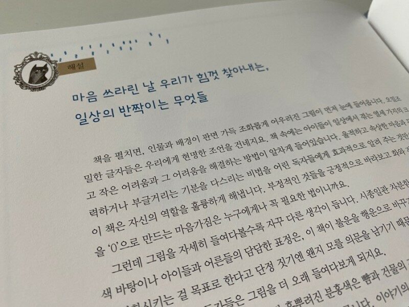 + 출판사: 책속믈고기 글: 알프 괴칼프 그림: 알렉산드라 파비아 옮긴이: 김배경 해설: 소이언 사진1 사진2 매번 겪으면서도 익숙해지지 않는 순간이 지금 나에게 또 찾아왔다. 세상에 나만 남겨진 것 같은 순간… 그런 순간은 단순히 속 상하고 울적한 날은 아니다 절망의 늪에서 중력보다 더 한 힘으로 나를 끌어당기는 그런 관성이 느껴진다. 삶이 한 없이 초라해지고 더 이상 튕겨 올라갈 것 같지않은 느낌뿐일 때 그동안 나는 원망과 불평만 했었다. 한번도 기회를 달라거나 이 만하기가 참 다행이다 이 정도 시련은 감사하다하라고 말했던 적이 없었다. + 그동안 참 감사함을 모르며 지내온 시간들이었나보다. 그 깨달음을 주기위해 많은 하락을 직접 겪어보라고 이런 기회도 주어지니 말이다. “매일매일이 인생에서 가장 아름다운 날이 될 수 있는 기회를 주세요” -마크 트웨인- 사진3 사진4 그림책이 주는 위로는 생각보다 크다. 짧은 이야기 속에 담겨진 길고 긴 이야기들을 제대로 이해하기 위해서는 그 옆에 그 뜻을 담고 있는 그림을 들여다보면 된다. 투박하지만 전달하고자 하는 내용은 상투적이지 않고 간결하지만 그 내용은 절대 간결하지 않다. 사진5 <해설> 그림책에 들어있는 이런 공간 정말 매력적이다. 화나고 속상한 마음 울적하고 답답한 마음 그런 마음들에게 기회를 줘도된다는 따뜻한 마음 한 조각 나이가 들고 세상에 대한 폭넓고 다양한 경험들이 모여 만들어진 나!!! 이젠 그런 나에게도 기회를 주고싶다. 그동안 잘 해왔다고!!!! 토닥토닥!!!!