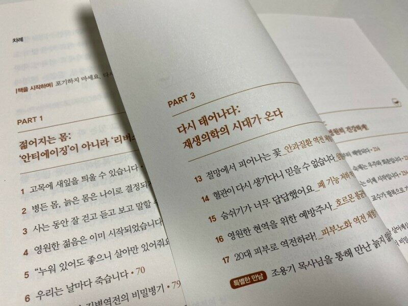 + 출판사: 쌤앤파커스 지은이: 라정찬 #쌤앵파커스 #라정찬 #김혜자 #엄홍길 사진1 사진2 제목이 주는 워딩 그대로의 느낌은 음….뭐랄까? 조금은 무섭다는 것!!! 아무도 늙지않는다면…? 아무도 죽지않는다는 거고 그렇게된다면 벌어질 일들은…? 내가 사랑하는 사람들이 늙지않고 죽지않는다면 더 바랄 것이 없지만… 순리대로 살아야한다는 것이 어찌보면 가장 편안한 삶을 살아가고 있다는 반증이라는 것을 세월이 주는 지혜처럼 경험하고 있어서랄까~ 그래서 더 내용이 궁금해졌다. 그 안에 담긴 숨은 내용들이 무엇일까~!!! + 각 파트별 하단에 들어있는 유명인들의 이야기 매력적이다. 사진3 사짘4 사진5 줄기세포라는 어감은 20 여 년 전 전세계가 열광했던 그 사건 이후…그리 긍정적인 어감은 아니었지만 그렇다고해서 그 순기능을 무시하기도 쉽지않다는 것!!! 성인의 몸에 존재하는 줄기세포는 성체줄기새포라고 한다. 태반이나 재대혈 그리고 뱃살과 같은 지방에 많이 있다고한다. 표피 밑 피부줄기세포로 인해 우리 몸의 피부는 오래된 세포가 사라지고 새로운 세포가 생기면서 평생 유지된다고 한다. 이렇게 새로운 세포가 지속적으로 생성되는 것은 줄기세포가 건강하게 뿌리내리고 있기 때문이라고한다. 이런 줄기세포의 연구는 알츠하이머병. 류머티즘관절염. 자가면역성. 난청 등등 치료의 과학적 의료기술은 우리나라가 세계적으로 우수하다고한다. 이렇게 줄기세포를 이용해 치료할 수 있는 질병들은 점점 더 그 범위가 넓혀가고있다. 줄기세포를 통해 생체 시계를 거꾸로 돌릴 수 있다는 것을 의미한다. 즉 더이상 늙지않고 재생된 세포들로 건강을 유지할 수 있다는 이야기일듯하다. + 다양한 줄기세포의 이야기들이 담겨져있는 이 책을 통해 우리의 의료과학기술의 그 한계가 무척 궁금해진다. 소중한 생명을 다루는 의료인들은 그것이 단순한 의술이 아닌 하늘이 내린 소명이란 것을 한 번 더 인지해야한다는 것을 또 한 번 느꼈다. 지은이는 스스로 그 줄기세포를 본인 몸을 통해 꾸준히 임상실험을 하고있단 첫 부분의 내용을 보면서 많이 놀라웠다. 연구의 확신과 더불어 나에게 먼저 그 결과치를 그리고 경험치를 실험해본 것이니…. + 건강한 삶 그리고 아름다운 마침표를 찍어야겠다는 생각이 더 들게했던 이야기들!!!!