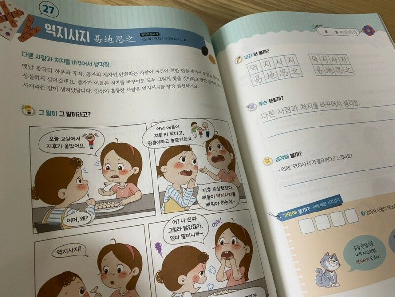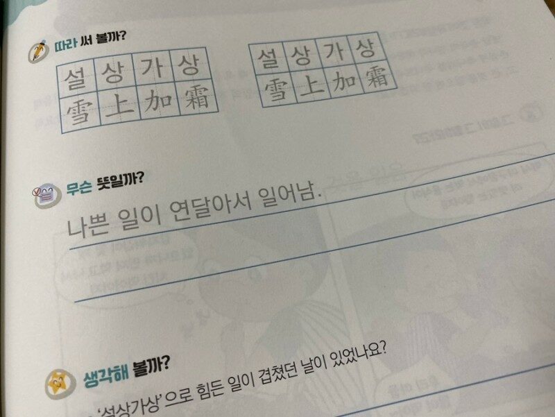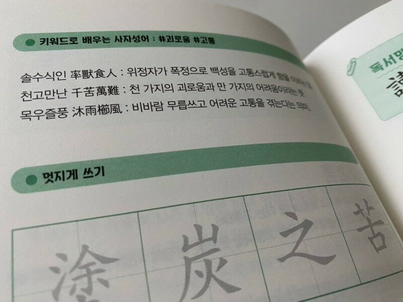 + 출판사: 하늘아래 지은이: 신성권 ”10대라면 반드시 알아야 할 사자성어“ #하늘아래 #사자성어를알면문해력이보인다 #10대라면반드시알아야하는사자성어 #사자성어유래담 #겨울방헉사자성어공부하기 #국어력향상 #문해력향상 #신성권 #사자성어익히기 사진1 사진2 사자성어를 알면 언어 생활의 감칠맛이 늘어난다는 사실은 언어를 구사하는 사람들 즉 언중들이라면 누구다 다 아는 사실!!! 언중들끼리의 사회적 약속이긴하지만 같은 문화 그리고 그 안에서 생활하지않으면 그 말의 뜻을 이해하기란 쉽지않다는 것도 우리가 이미 다 알고있는 사실!!! 그래서 외우고 꼼꼼하게 익혀가야한다 상황에 맞는 한 마디의 사자성어가 똑~ 떨어진다면 참 매력적이니까!!! + 더불어 국어력을 중요하게 생각하는 국어. 영어. 사회. 과학까지 그 쓰임새나 문장의 이해력 그리고 정보들의 조합까지 이루어져야 수능 국어.영어 독해는 물론 수학.과학의 문제들까지 이햐할 수 있으니 부지런히 익혀가야하는 부분이다. 사진3 사진4 사진5 책의 구성은 알차고 세심하게 되어있어서 재미있게 학습하고 익힐 수 있도록 되어있었다. 사자성어의 유래담이 일단 무척 마음에 들었다. 물론 유래담없이 사자성어의 뜻과 글자풀이만 되어있어도 학습 시 그리 큰 부담은 없지만 이런 유래담이 함께 들어있으면 좀 더 오래 그리고 좀 더 풍부하게 기억할 수 있어서 좋기때뭄이다. 더불어 한자 하나하나의 뜻풀이와 쓰기연습을 해 볼 수 있는 공간도 상당히 매력적이다.