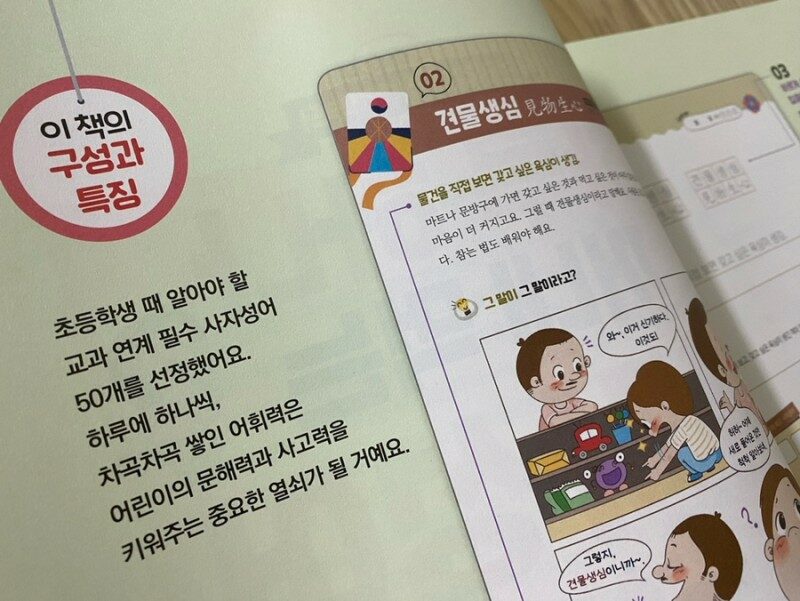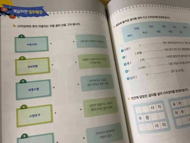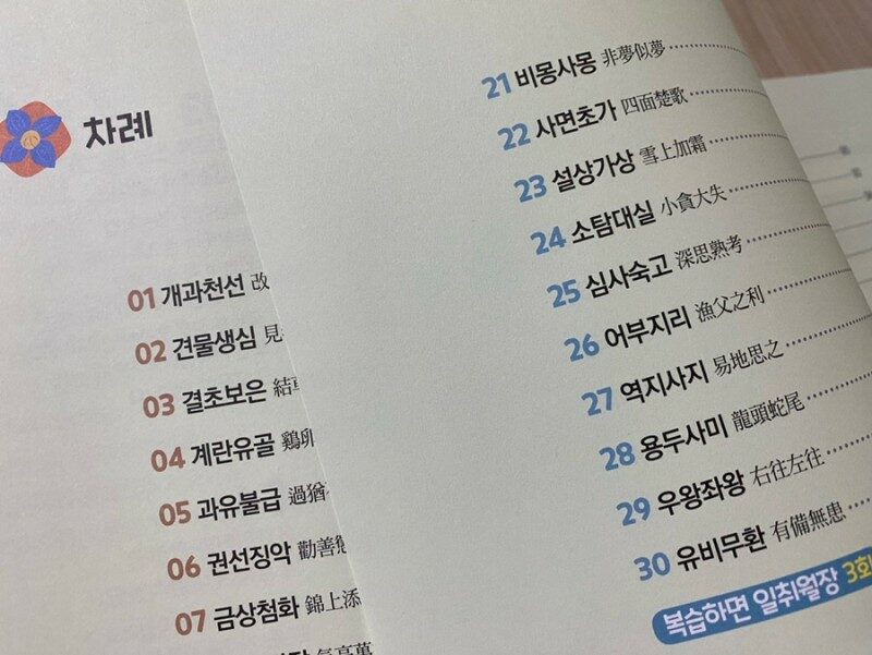 + 출판사: 마카롱 글: 우당탕실럼실 그림: 황재윤 교재명: 하루 하나 꺼내먹는 사자성어 따라쓰기 #출판사마카롱 #하루하나꺼내먹는사자성어따라쓰기 #초등교과연계사자성어 #겨울방학초등독해력 사진1 사자성어 우리집 청소년들 놓친 사자성어가 요즘 왜이렇게 눈에 자꾸 밟히는건지!!!! 길고 긴 이야기들을 간단하게 단지 4글자로 마무리할 수 있다는 매력이 넘친다. 전체 내용을 압축해서 마무리할 수 있다는 것!!! 볼수록 매력적이다. 사진2 사진3 <책의 구성> 교과연계 필수 사자성어 50개를 선정해서 정확한 독해를 위해 학습할 수 있도록 되어있다. 더블어 복습을 통한 다져가는 공간까지 들어있어서 책의 활용범위가 넓다. 정확한 뜻 그리고 그 쓰임새를 꼼꼼히 익혀가야 문해력이과 독해력에 도움이 되니 부지런히 익혀가는 겨울방학을 보낼 수 있는 구성으로 이루어진 책이다. 사진4 사진5 뜻을 익혔으나 그 쓰임새가 정확하지않다면 오히려 힘든 상황이 될 수 있다는 사실!!! 그 뜻을 꼼꼼하게 익혀서 교과와 연계될 수 있도록 해주었다는 것이 책의 장점 중 하나!!! 사진6 사진7 사자성어의 정확한 쓰임새를 다양한 컨텐츠로 익혔다면 복습으로 마무리하면 된다. 초등 교과 연계이긴하지만 성인들도 익히기좋고 특히 어르신들 기억력 소환이나 치매예방에도 도움이 될 듯하다. 교재를 학습하는동안 집중을 하는 시간이 매일 일정하게 이루어진다면 아이들에겐 학습력과 집중력 그리고 문해력이 그리고 성인들에겐 이미 저장된 기억을 좀 더 다져가는 시간이 될 수 있으니 그 누가해도 나쁘지않아 보인다. 이번 겨울방학동안 화두로 떠오르고있는 문해력의 그 기본기를 튼튼히 다져가는 시간으로 이 교재와 함께해보는 것도 다음 새학기 새학년에 대한 든든한 원동력이 되어줄테니!!!!