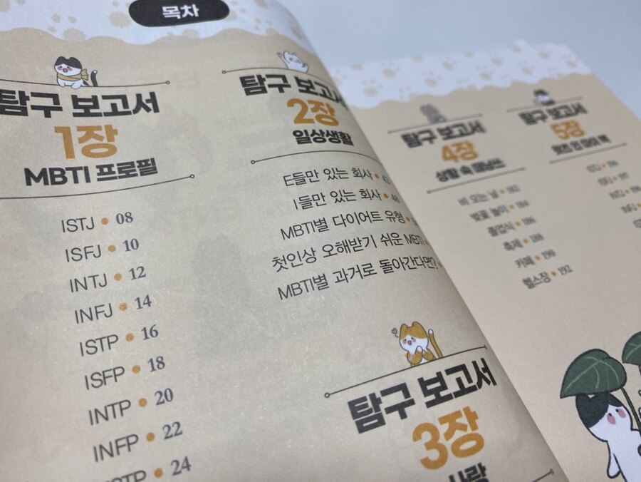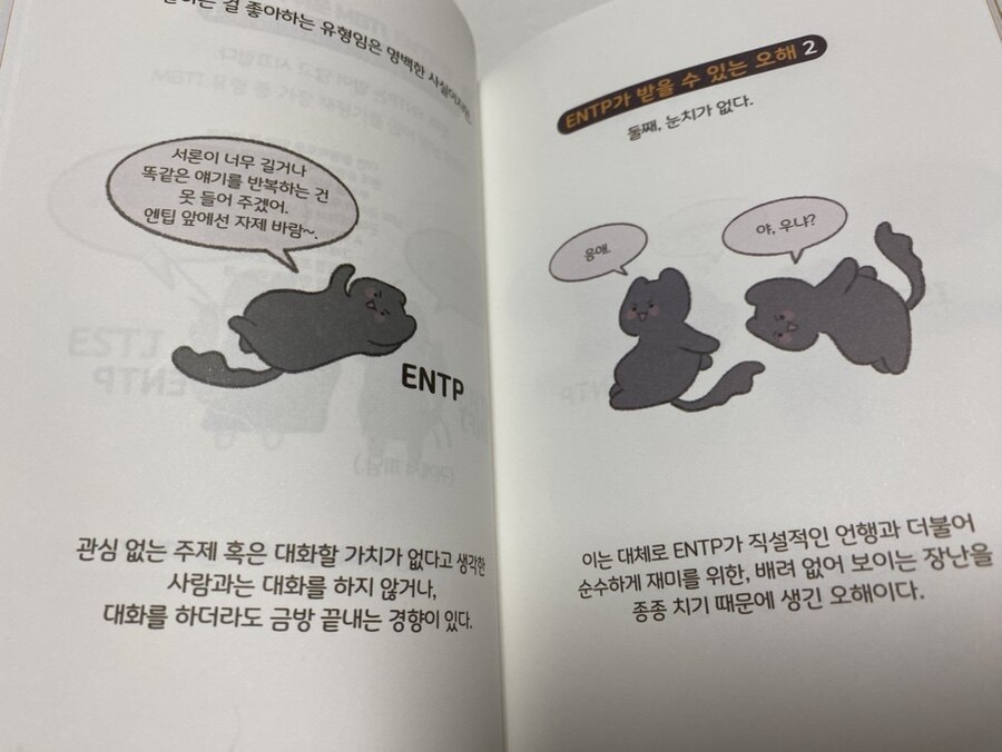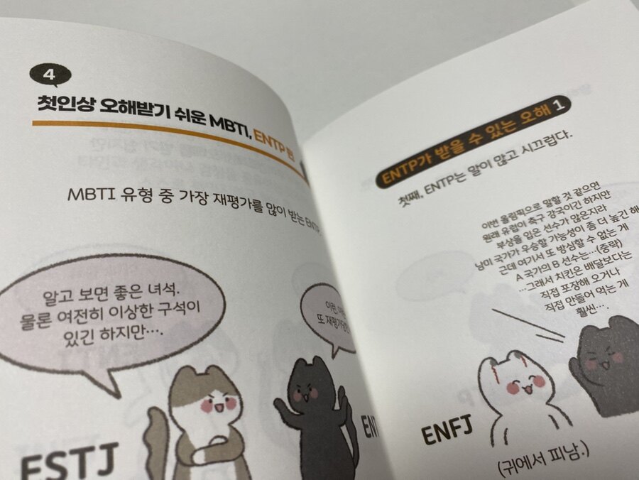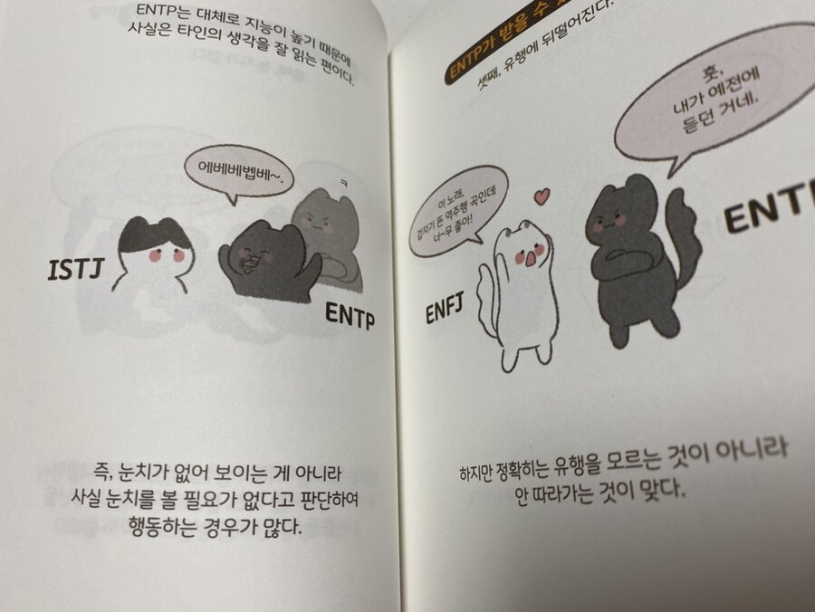 + 출판사: 대원앤북 원작: 떼껄룩 글.그림: 도효진 감수: 고영재 사진1 사진2 그동안 나는 나를 나타내는 MBTI가 없다고 생각했었다. 할 때마다 달라지는 결과며 딱 맞아떨어진다는 생각도 들지 않았기 때문이었다. 이번에는 어떨지? 적절한 MBTI를 찾아낼 수 있을지 무척 기대되었다. 사진3 나의 MBTI ENTP 가장 비슷한 유형이라 생각한다. 가장 궁금한 것은 나만 MBTI가 자꾸 변하는 건가? 라는… 규정지을 수 없다는 것이 오히려 당연하겠지만 요즘은 첫 만남에 혈액형을 묻는 것이 아닌 MBTI를 물어보며 그 상대방의 대략적인 흐름을 판단을 하는 경우가 대부분이다. 그래서 나도 나의 MBTI가 필요했다. 사진4 사진5 사진6 ENTP가 받을 수 있는 오해 1. 말이 많고 시끄럽다 2. 눈치가 없다 3. 유행에 떨어진다 즉, 남들이 다 해 보거나 좋아하는 것에는 관심이 없다. 남들이 많ㅇ 한다는 것은 그만큼 흔하다는 것이기 때문이다. 흔한 것보다는 특별한 것, 나만 알고 있는 것을 더 중시한다. 넘치는 자신감, 거침없는 언행과 더불어 솔직한 성격!!! 시간을 두고 알아갈구록 많은 장점이 보이는 유형이니 쉽게 판단하지 말자!! + 그동안 궁금했던 MBTI 물론 인터넷에도 많이 있지만 이렇게 꼼꼼하고 논리정연하게 정리되어있는 포스팅은 잘 없지않나??? 할 때마다 바뀐다고 생각했던 나의 성격 유형을 결국 가장 비슷하게 찾았다. 주변인들부터 하나둘씩 맞춰봐야겠다. 결국 MBTI!!!!