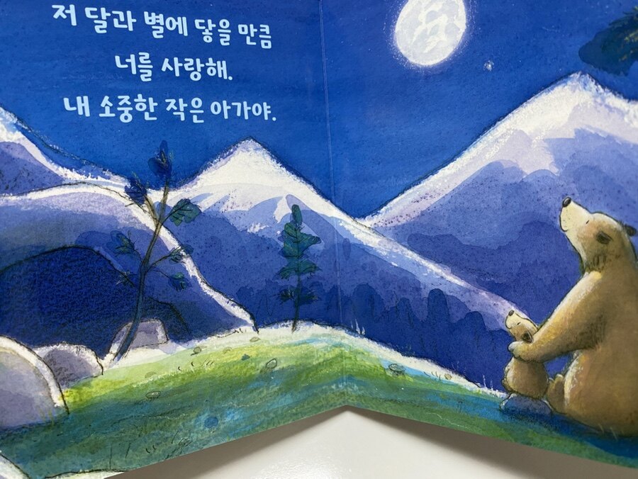 + 출판사: YUNA 그림: 팀 원스 글: 아멜리아 헵워스 번역: 권효정 사진1 사진2 파란 색감이 유난히 돋보이는 그림 책 한 권 보고있는 것만으로도 육아스트레스에서 벗어나는 그 매력 + “전 세계 부모들이 선택한 그림책 아기가 잠들기 전 사랑을 전하세요 아마존닷컴 200만부 돌파! 아마존 베스트셀러 1” 사진3 아기 곰과 엄마 곰은 서로 아끼는 마음을 같은 곳에서 마주하고 같은 곳에서 공감하는 그림이 담고있는 메시지가 그대로 전달된다. 딱히 비싸고 좋은 것을 주고받지 않아도 서로 사랑하고 아끼는 그 마음만으로도 전해지는 마음과 마음들 사진4 아침에 함께 눈을 뜨고 저녁에 함께 잠을 자는 그 순간까지 엄마 곰이 아기 곰에게 전달하는 사랑의 마음이 글보다 더 한 감동으로 전해진다. 더이상 아기들이 엄마를 찾지않아 마음 한 켠이 쓸쓸한 나에게 많은 감정들을 느끼게 해 주는 사랑 가득한 그림책!!!