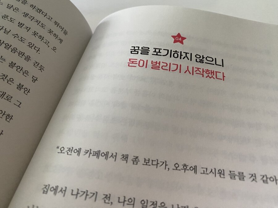 + 출판사: 두드림미디어 지은이: 노지현 사진1 사진2 인생 2막을 준비해야하는 시기라는 것을 난 내가 직접 걲기 전까지는 전혀 모르고 지냈다. 지금까지 살아온대로 그렇게 인생이 풀려가고 또 다가올거라고 상각했었는데 그건 어디까지나 노후 생활에 대한 무지로 똘떨 뭉첬던 나만의 착각이었다. 그래서 지금 그 대가를 톡톡히 치르며 생활 전선에서 매일 고군분투 중이다. 경제적 독립이 무엇인지 그리고 굳이 내가 직접 일하지 않아도 수익이 나는 그 구조를 다양한 사람들의 이야기를 통해 간접 경험 중이다. 일하지 않고 버는 수익이란? 과언 있을까? 편하보이규 쉬워보이는 일이란 것이 있을까? 글쎄… + 학교를 그만두고 고시원을 차린 이유는 분명 그 어떤 신념이 있을 것이다. 그 뜻을 헤나려보고 나도 나의 꿈을 펼쳐보고싶다. 사진3 사진4 난 나의 노후준비가 전혀 되어있지 않음에 근래 많이 우울한 시간을 보냈다. 쥐뿔도 없는데 왜 마냥 손놓고 있었던 것인지 사실 대략 난감하다. 사실 마음 속으로 하고싶은 일은 있지만 경ㅈ적인 이유로 망설이고 있는 중이기도 하고 선뜻 시작하기가 두럽기도해선데 지은이는 어떤 마음으로 그 두려움을 견디고 극복했는지 두루두루 궁금한 부분들이 많다. + 부정적인 생각과 감정은 인간을 무기력하게 만들어 행동하지 않게 한다고 한다. 아무것도 하지 않으면 아무 일도 일어나지 않는다는 사실은 우리는 세상을 살아오면서 이미 잘 알고 있다. 더불어 행동과 보상 사이에는 분명 기차가 존재한다는 것을 우리는 잘 기억해야한다. 내가 하고싶은 일이 있어도 저어하는 가장 큰 이유가 바로 이 부분이다. 경제력이 춘분하지 않으니 수익까지의 시차가 사실 힘들 것 같다는 생각이 들긴하지만 그건 사실 월급받는 생활을 하더라도 한 달이라는 노동의 시간 후라는 사실이 사실 참 견디기 힘든 부분이다. 50대를 살고 있는 나는 여전히 내가 하고싶은 꿈을 끊임없이 찾고있다. 포기하지 않는 마음이 결국은 내가 이루고싶은 나의 모습을 마주하게 해 줄거라 생각한다. 그런 이유로 오늘도 열심히!!!!