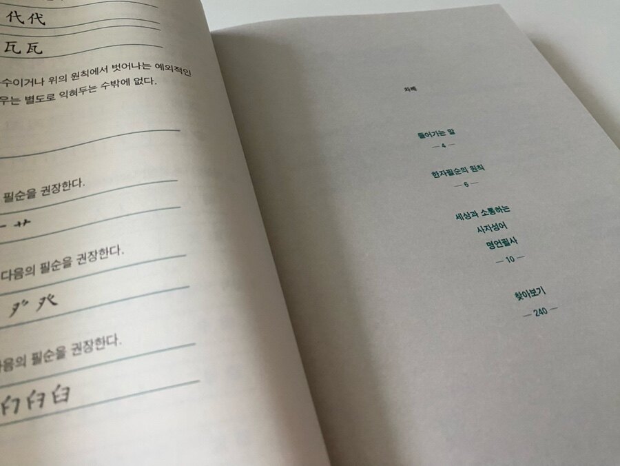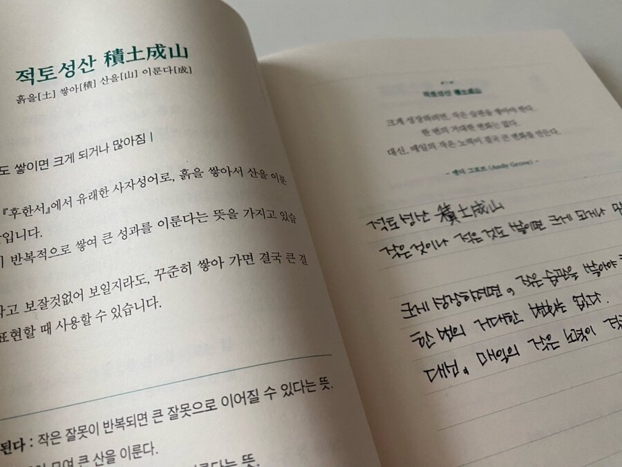+ 출판사: 하늘아래 지은이: 김한수 #하늘아래 #세상솨소통하는사자성어명언필사1 사진1 사진2 필사의 좋은 점은, 적어도 나에게는 심신의 안정이다. 집중럭은 물론이거니와 어지러운 마음을 펜끝에 집중해서 내 마음의 이야기에 집중하며 어지러운 마음을 가라앉힐 수 있기 때문이다. 더불어 사자성어와 함께하며 명사들의 명언까지 필사할 수 있어서 참 좋았다. + 책의 순서를 보면, 한자필순의 원칙까지 있어서 복잡한 획의 한자라도 한 획 한 획 적어내려가다보면 어느 순간 마음이 고요해짐을 느낄 수 있다. 사진3 사진4 사진5 총 115개의 사자성어와 명사들의 명언들이 있다. 처음 보면 사자성어보다는 평소 좋아하는 사자성어를 한 번 더 꼼꼼하게 필가할 수 있어서 참 좋은 시간이었다. 더불어 사자성어와 관련있는 명언들도 아주 괜찮았다. + 내 생각을 사자성어 하나로 나타낼정도의 삶을 꿰뚫어보는 눈이 있다면 얼마나 멋있는 일일까! 매년 말이 되면 그해를 나타내는 사자성어를 고르고 발표하는 학자들의 그 박학다식함이 사실 항상 부러웠다. 필사를 통해 올해 말에는 나의 1년의 삶의 모습을 꼭 사자성어 하나로 표현하고 마무리해보고싶다. 마음과 머리가 맑아지고 투명해지는 필사는 여러모로 정말 좋은 책 읽기면서 내 마음에 새겨두면 좋을 내용들이라 명언과 사자성어가 함께 들어있는 이 한 권으로 사자성어는 물론 한자도 익히고 명인들의 지혜가 담긴 한 마디 한 마디도 내 마음에 곱게 접어 간직하고싶다.