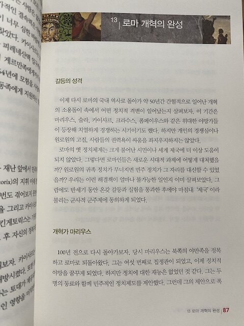 유럽 문명의 뿌리를 거슬러 올라가보면 그리스와 로마를 만날 수 있습니다. 현대 철학은 고대 그리스 철학자인 플라톤 철학의 주석에 불과하다고 할 정도로 이미 철학이 성숙하였고, 도시 국가였던 그리스의 직접 민주주의는 지금은 간접으로 바뀌었지만 현재 대부분의 나라에서 채택하고 있습니다. 이탈리아 반도의 로마에 있는 일곱 언덕에서 시작된 로마는 이탈리아 반도를 넘어 유럽 전역과 중동, 그리고 북아프리카에 이르는 대제국을 건설하였네요. 로마의 전성기인 오현제 시대에 대해 읽어보면 핏줄을 따라 황제가 되는 것이 아니라 어진 사람에게 자리를 넘기는 방식이었는데 그래서 번영을 누릴 수 있었던것 같아요. 조금씩 몰락하는 시점이 왕위를 자식에게 물려주기 시작한 때인 것을 보면 만약 이전과 같은 방식으로 양위가 이루어졌다면 역사는 매우 달라졌을 것입니다.